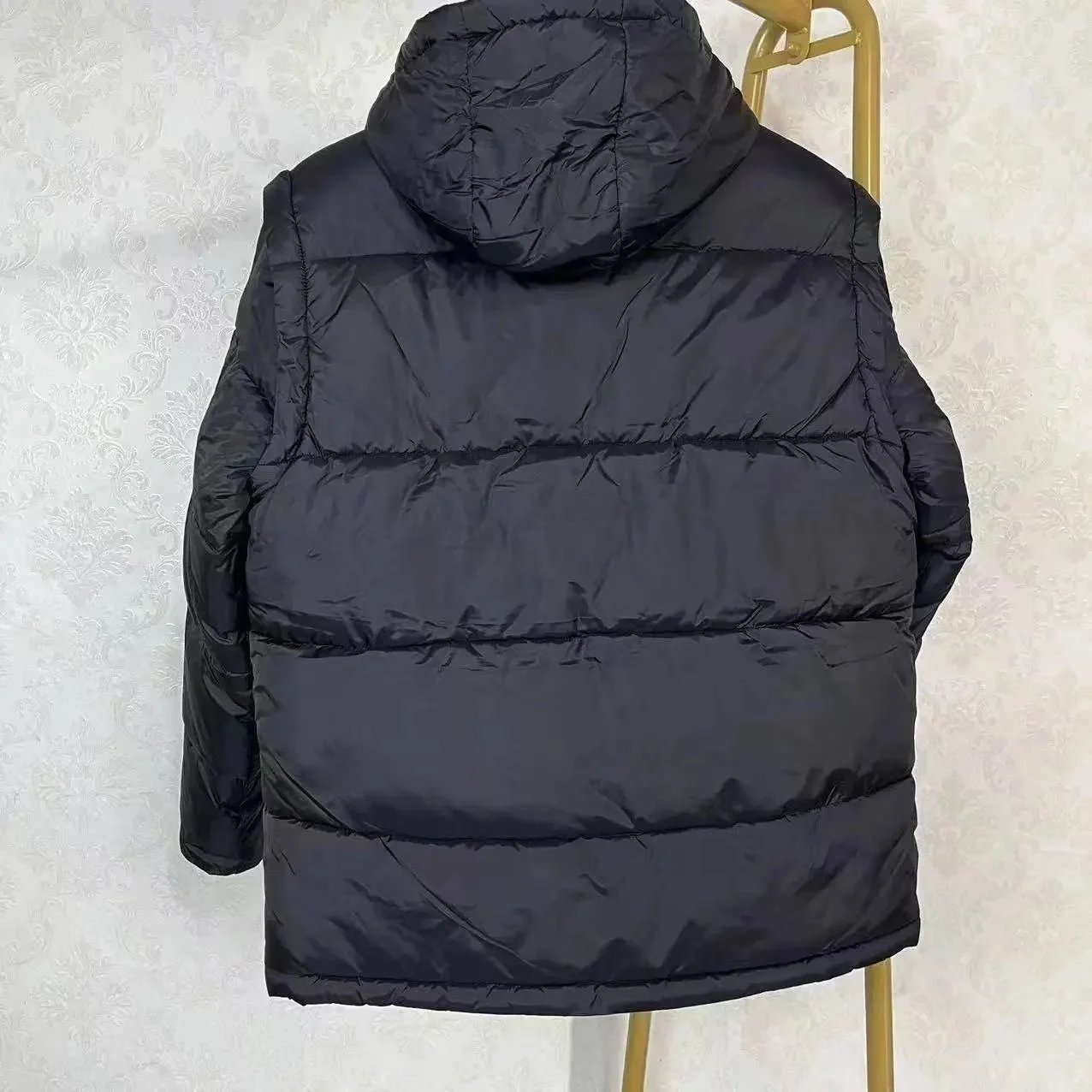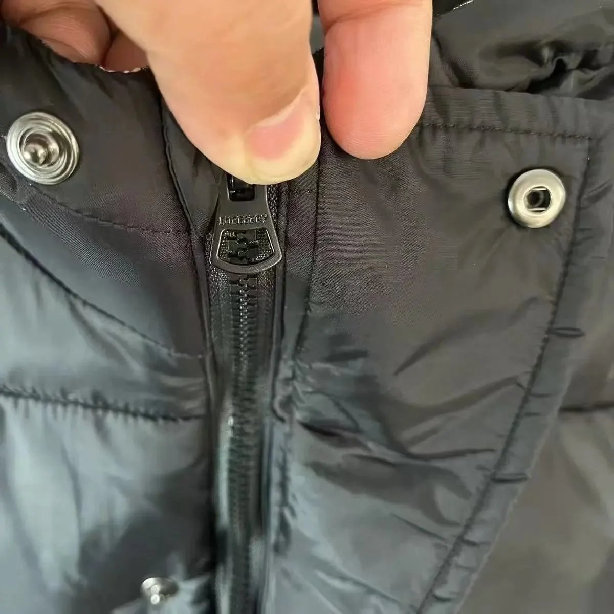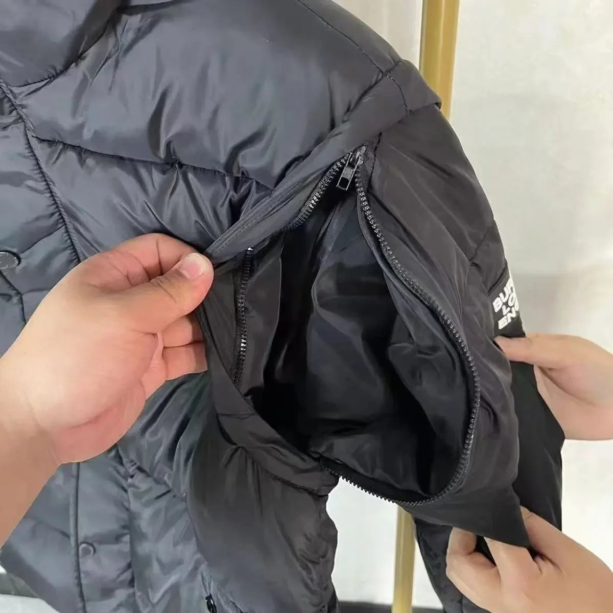 Stylish Burberry black hooded puffer jacket featuring a classic check-lined hood and signature logo patch. Perfect for cold weather with premium insulation and timeless design.