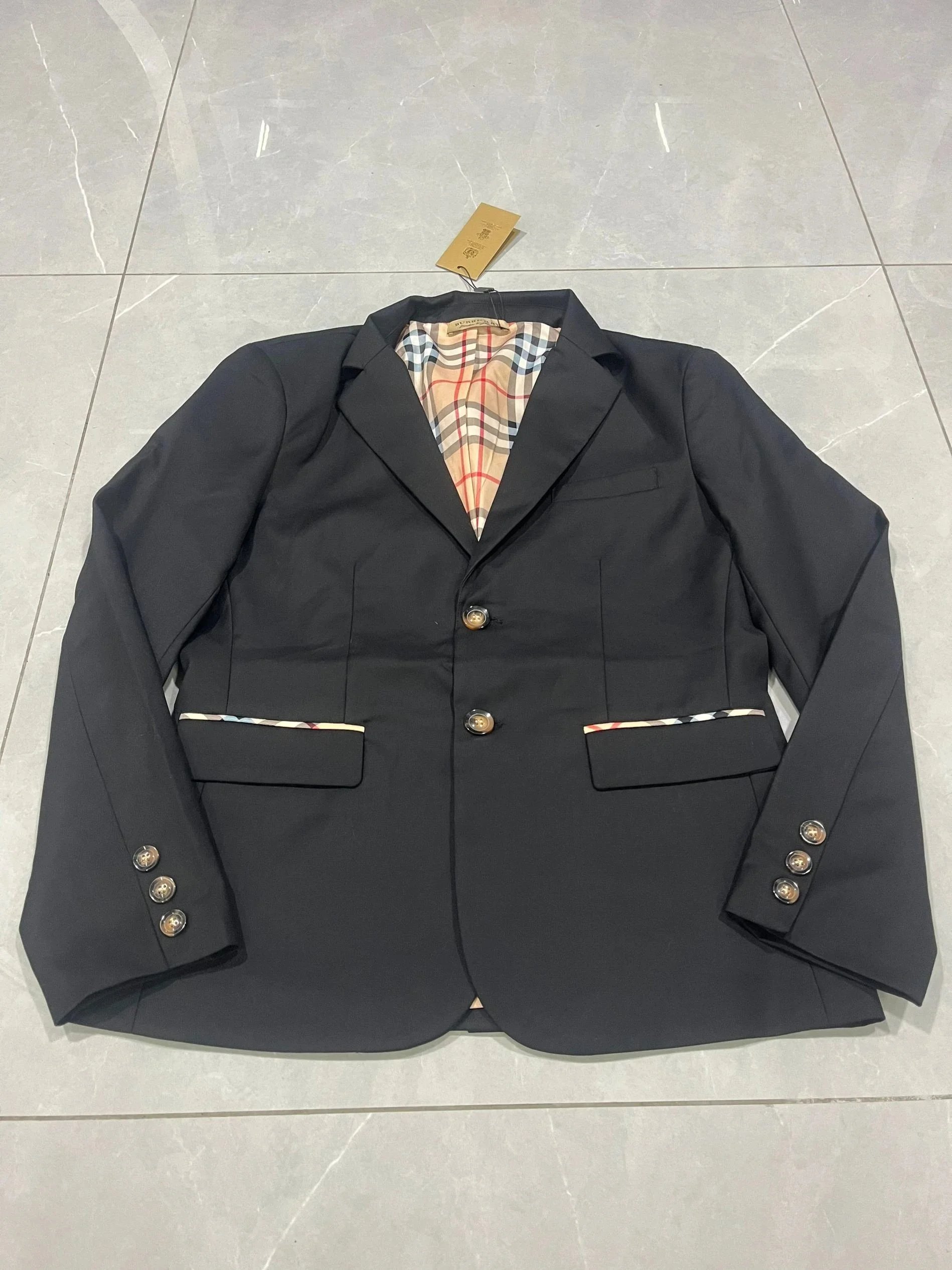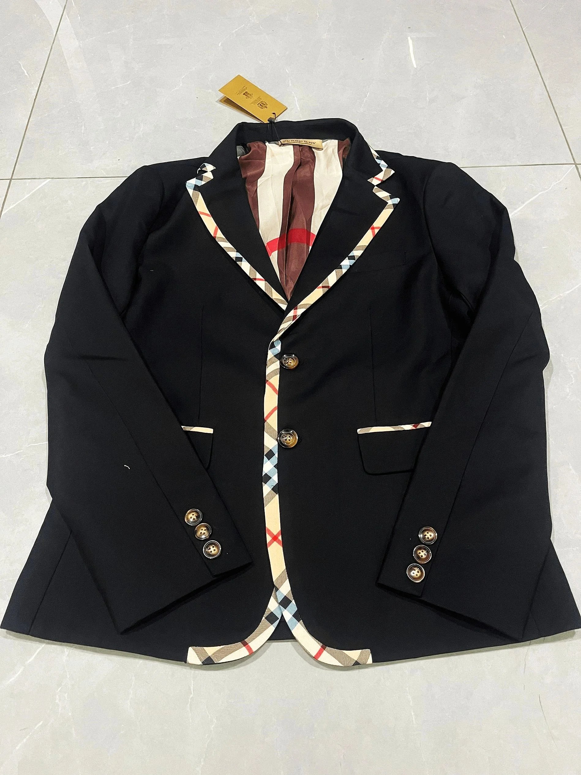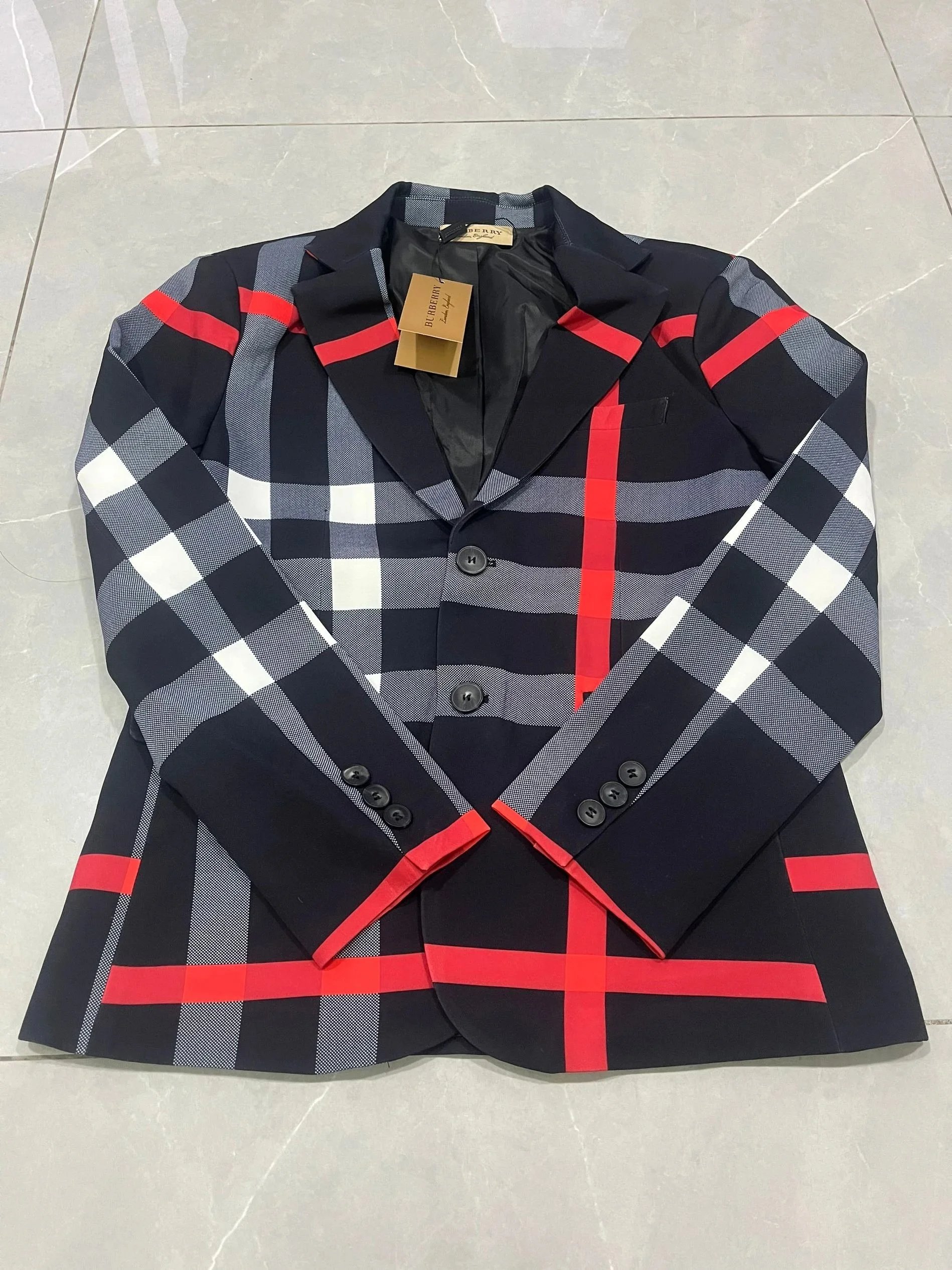 Authentic Burberry check pattern blazer featuring iconic beige, black, white, and red plaid design. Crafted with premium fabric and signature detailing for timeless elegance.