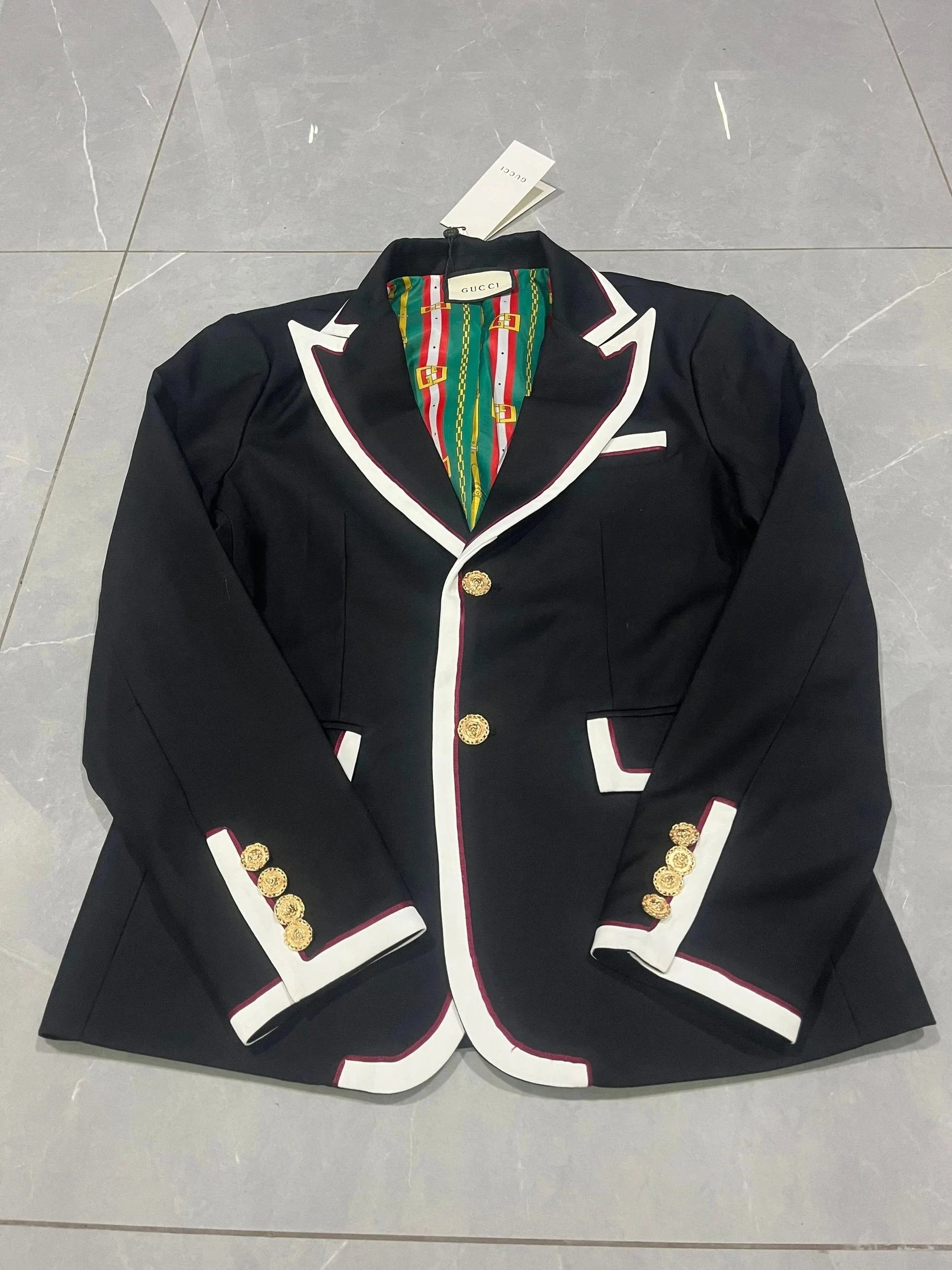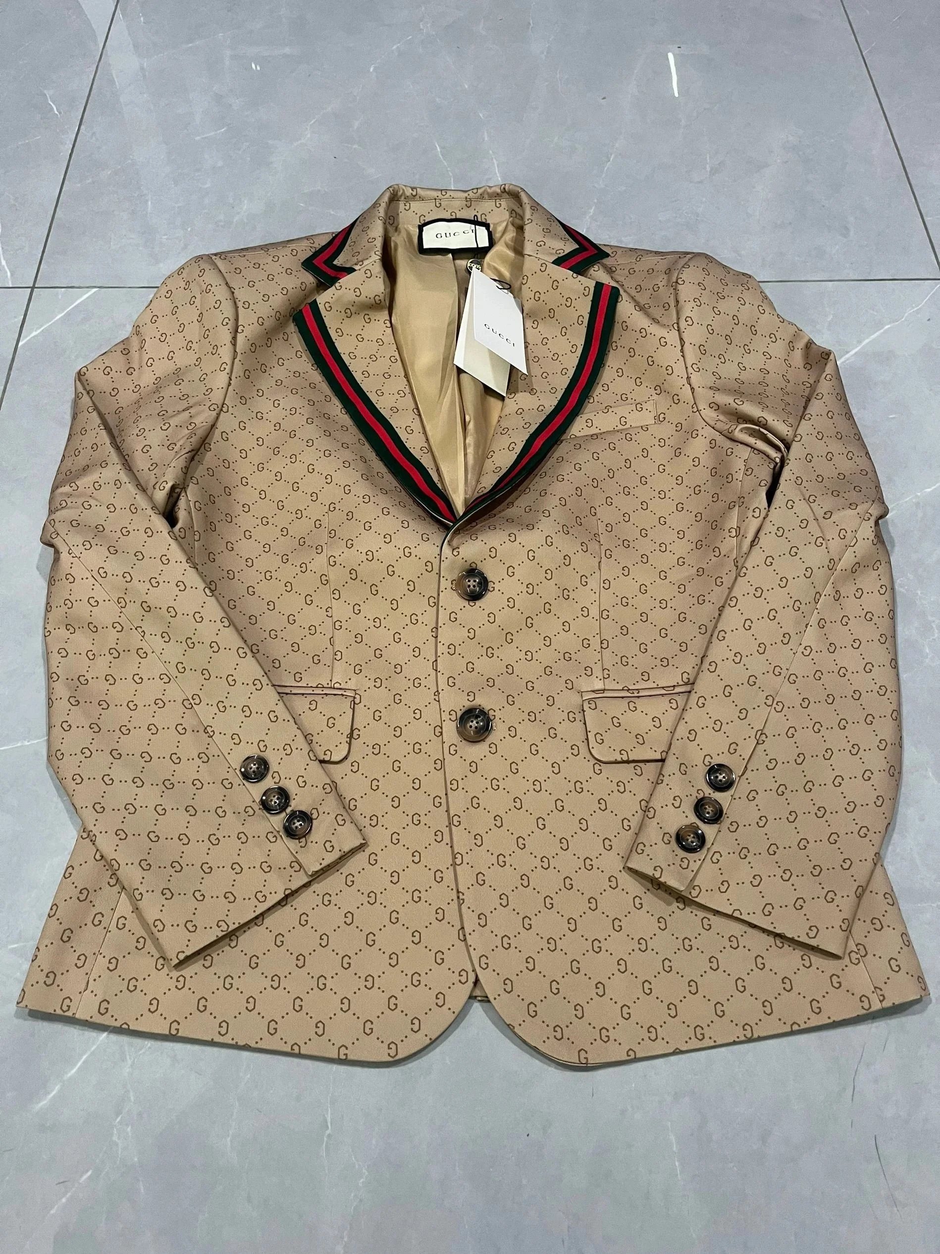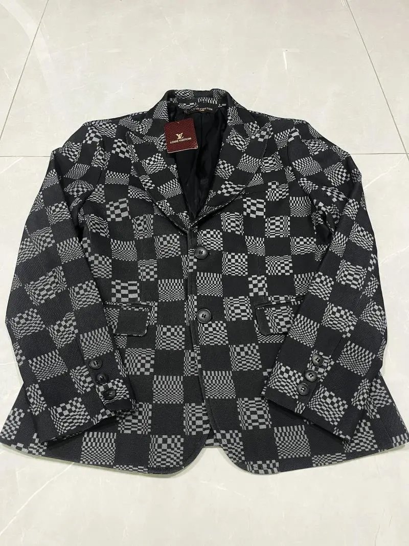 Authentic Burberry check pattern blazer featuring iconic beige, black, white, and red plaid design. Crafted with premium fabric and signature detailing for timeless elegance.