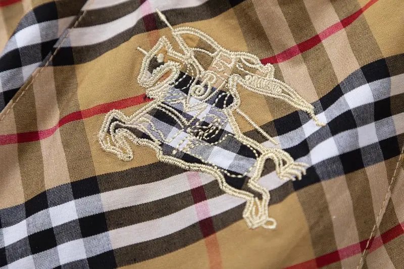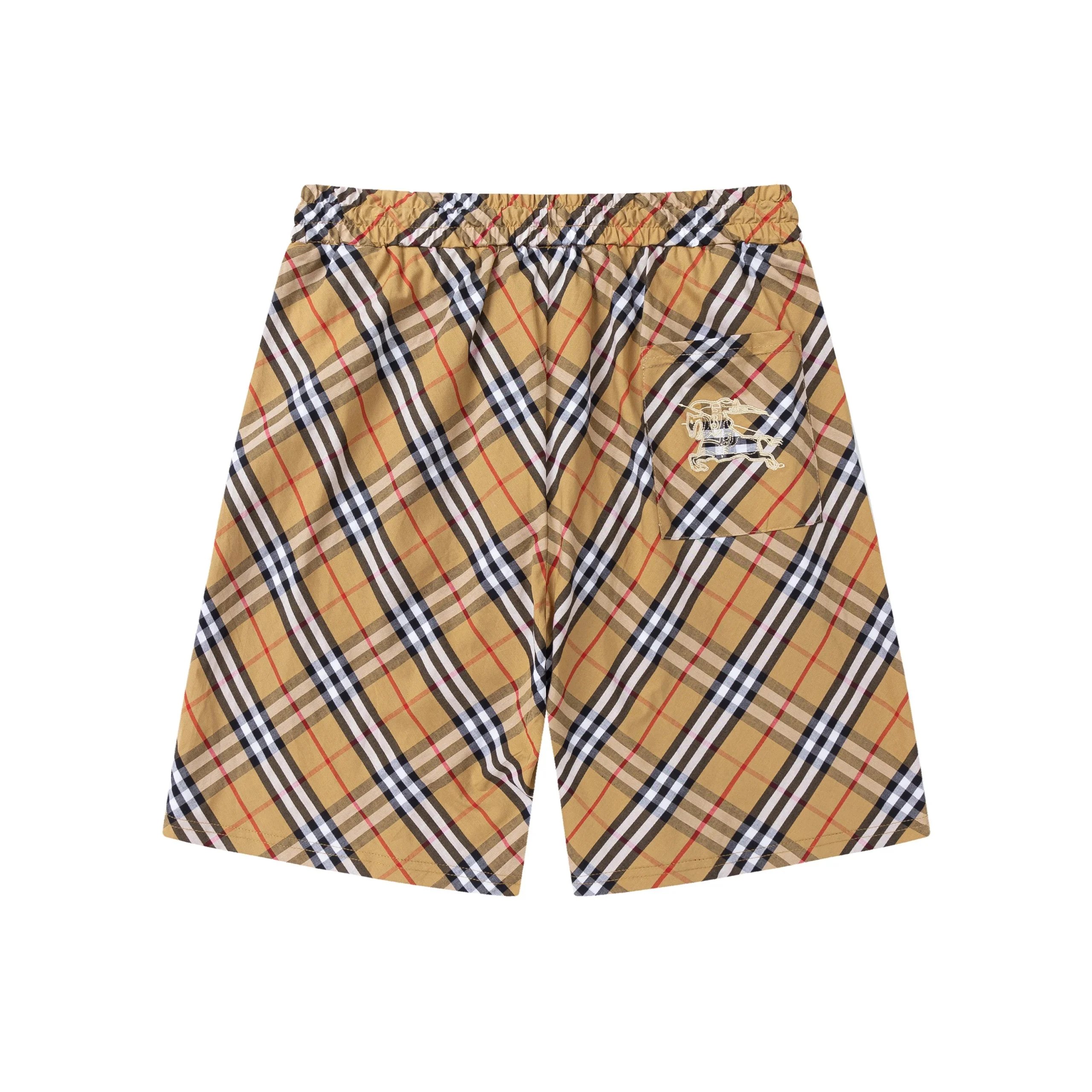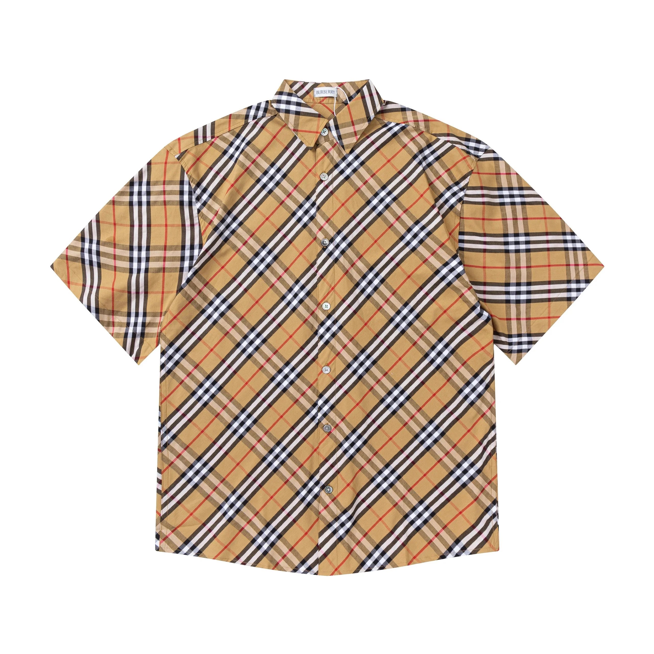 Elegant Burberry check pattern short sleeve shirt paired with matching drawstring shorts for a cohesive, upscale casual look. Ideal for warm weather or resort wear.