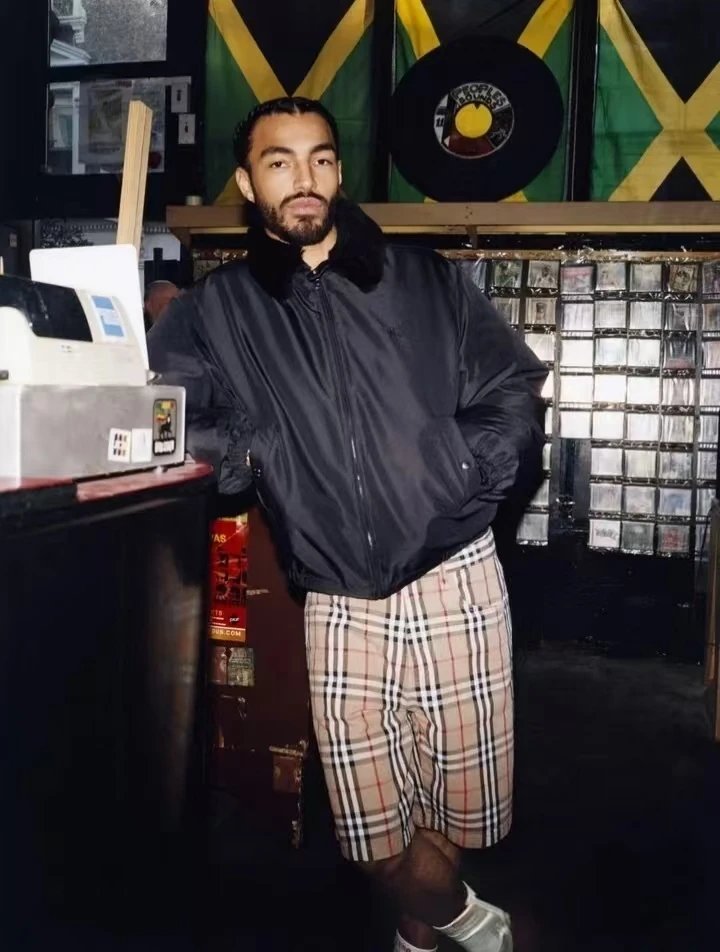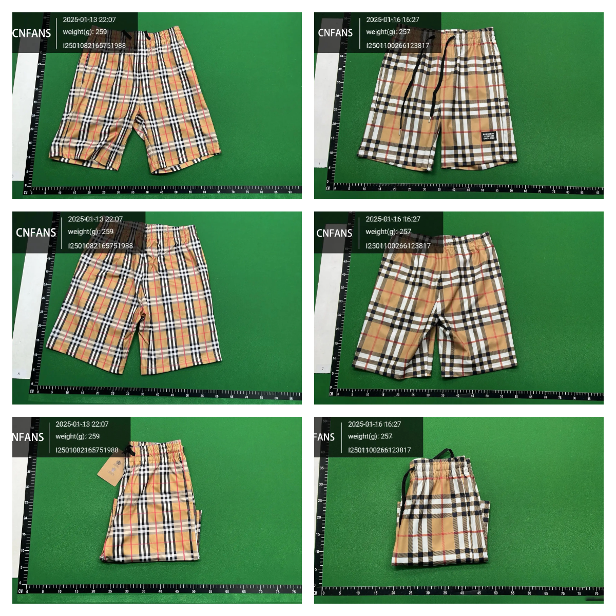 Stylish Burberry check swim shorts featuring the iconic plaid pattern in beige, black, white, and red. Perfect for a luxurious beach look with a drawstring waist for comfort.