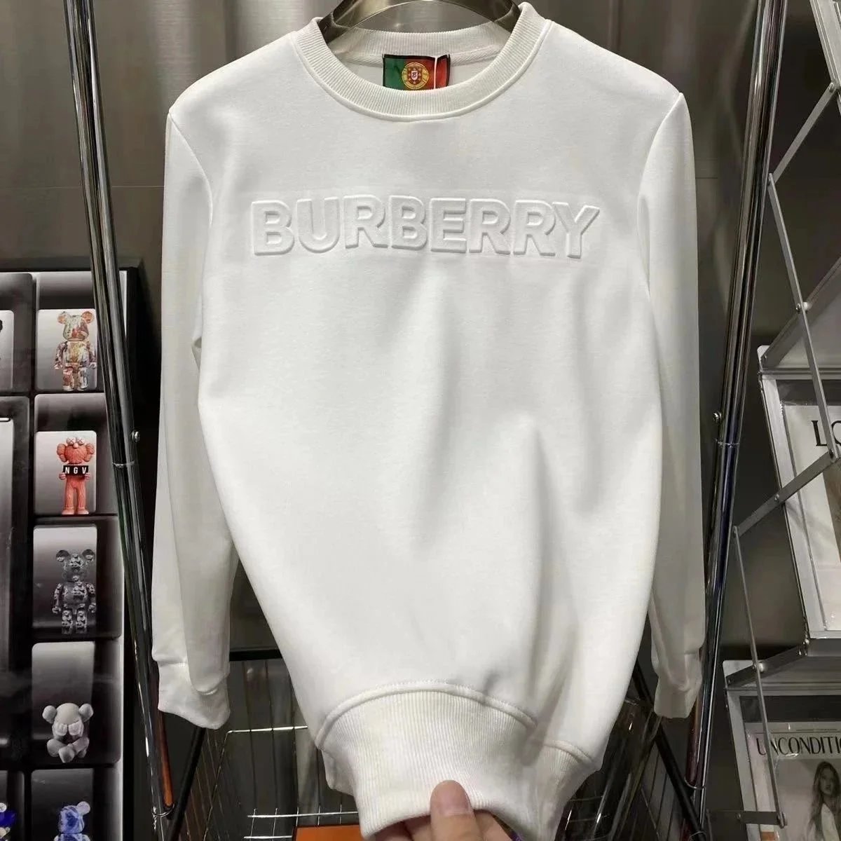 Elevate your wardrobe with this premium white Burberry sweatshirt featuring a bold embossed logo. Perfect for casual luxury styling.