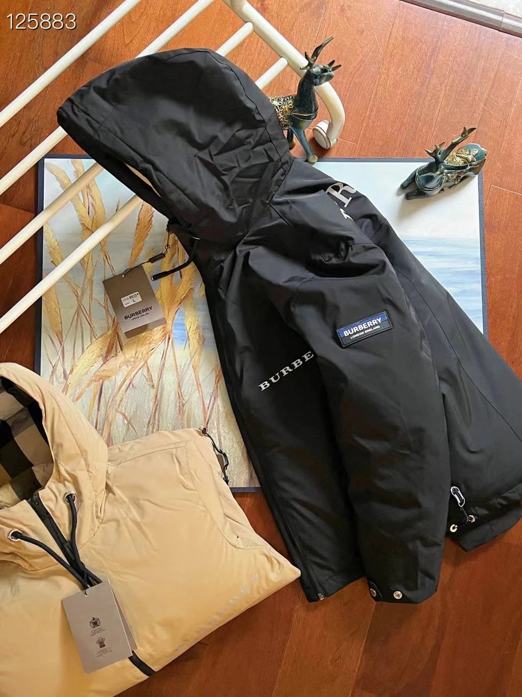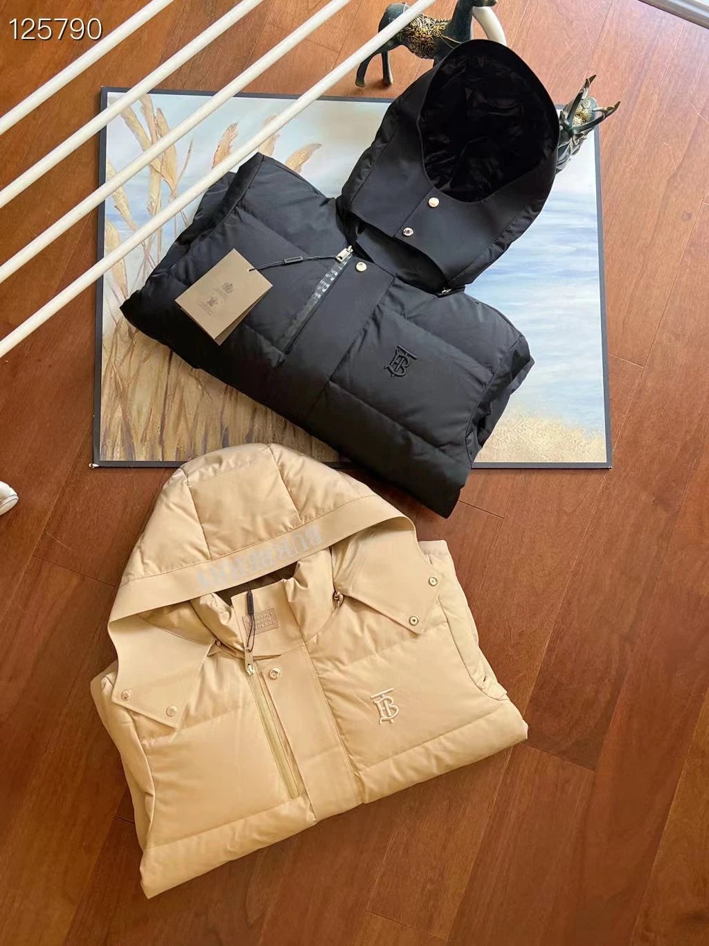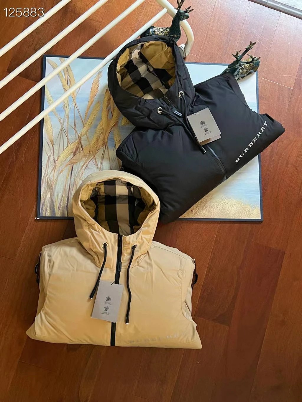 Premium Burberry men's hooded puffer jackets in beige and black, featuring water-resistant fabric, front zip closure, and signature logo branding for stylish winter protection.