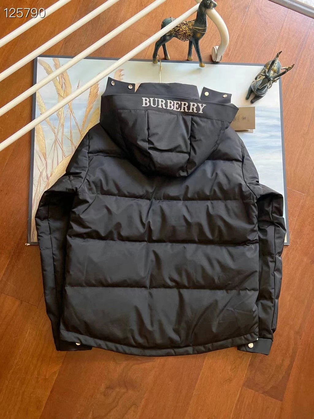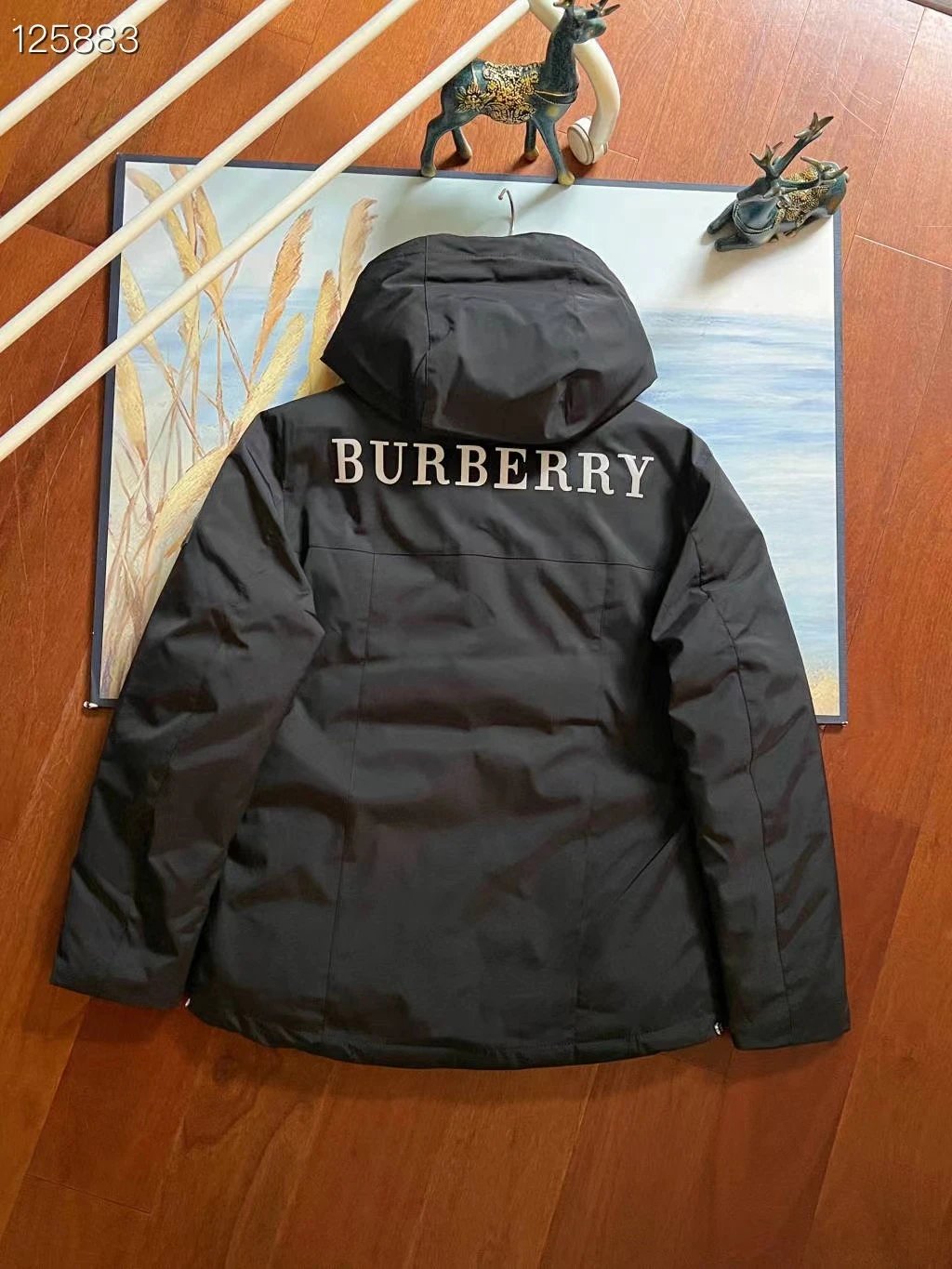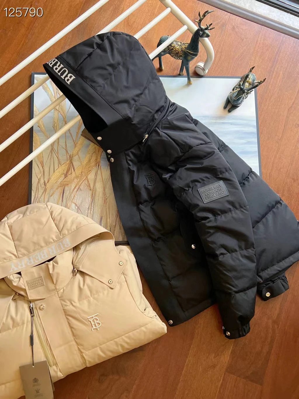 Premium Burberry men's hooded puffer jackets in beige and black, featuring water-resistant fabric, front zip closure, and signature logo branding for stylish winter protection.