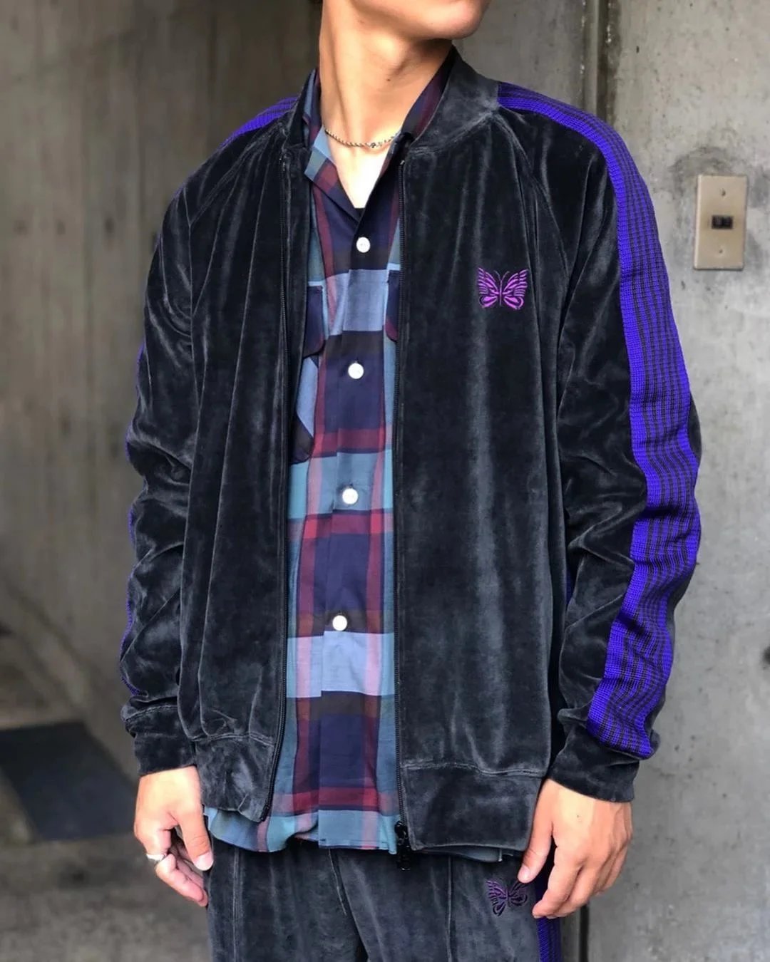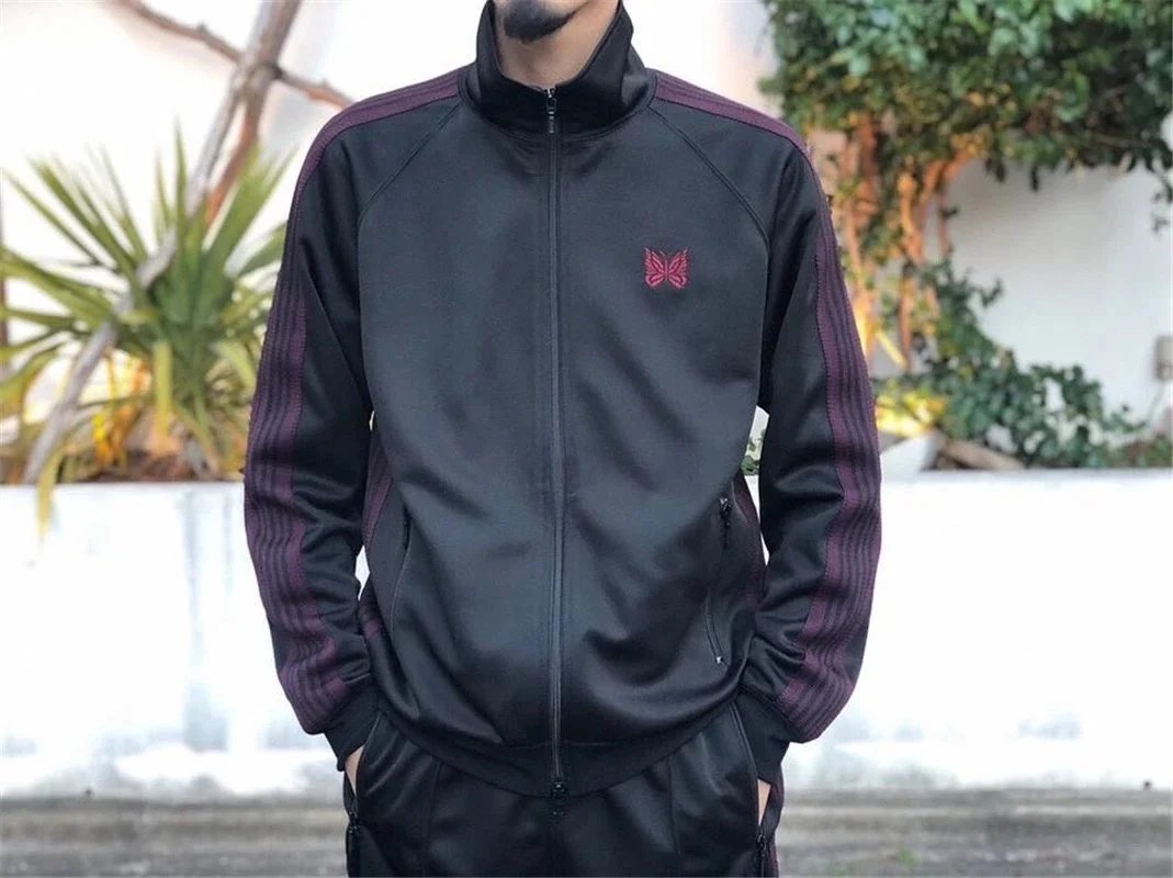 Stylish Butterfly track jacket and pants set featuring a navy blue and purple colorway with contrast sleeves and side zippers. Perfect for casual wear or light workouts.
