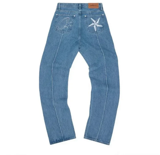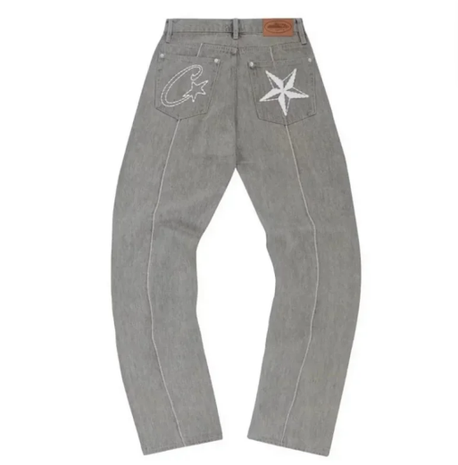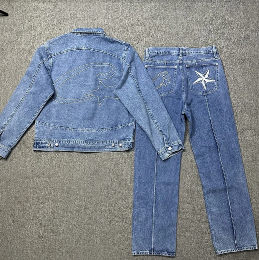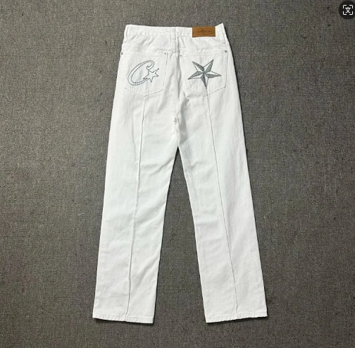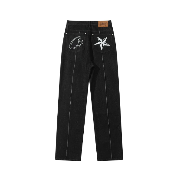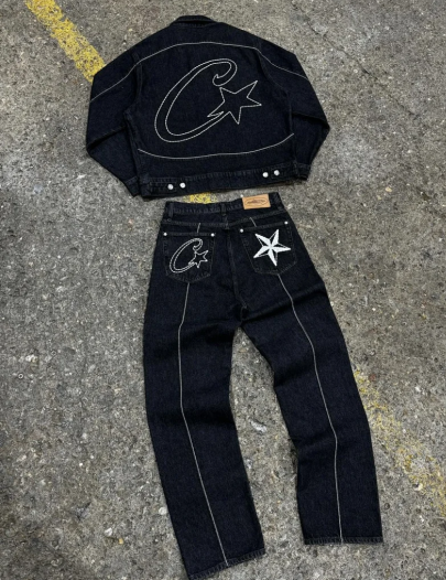 Explore the C*Star denim collection featuring embroidered jackets and pants in black, blue, white, and gray. Each piece showcases a distinctive star and 'C' logo design for a bold, statement look.