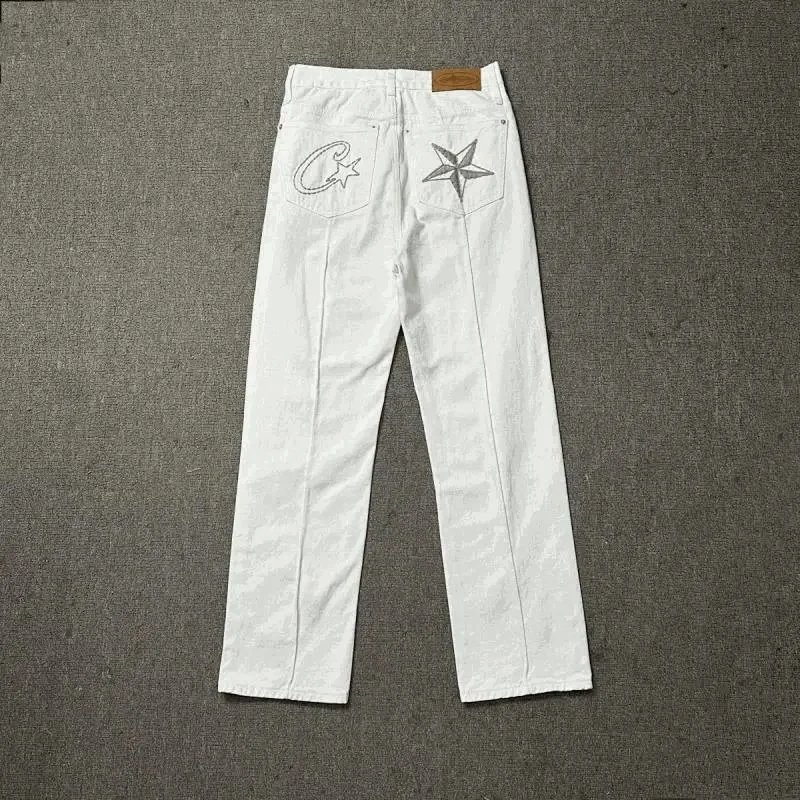 Stylish white denim pants featuring distinctive C*Star embroidery on the back pockets. Perfect for a bold fashion statement with premium quality craftsmanship.