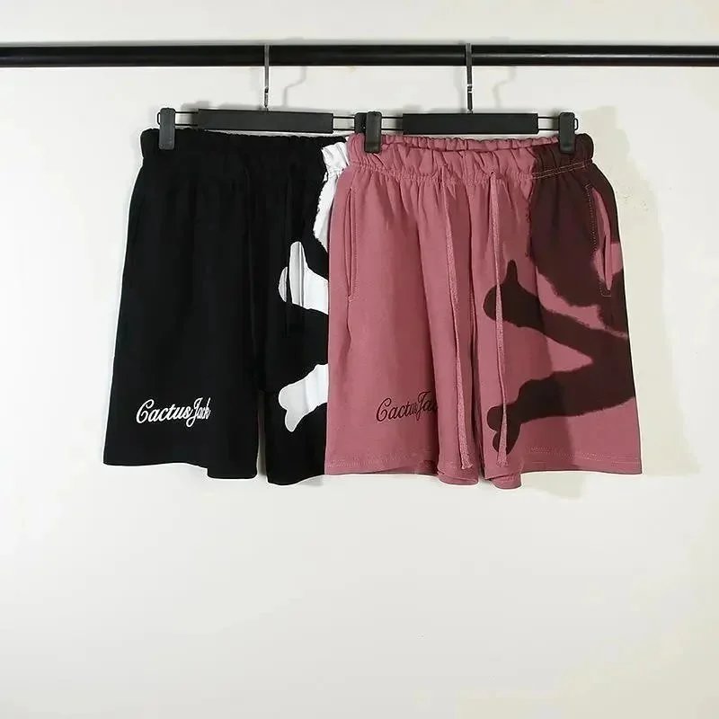 Stylish Cactus Jack camo-patterned shorts in pink and black-white colorways. Featuring elastic waistband and branded embroidery for a bold streetwear look.