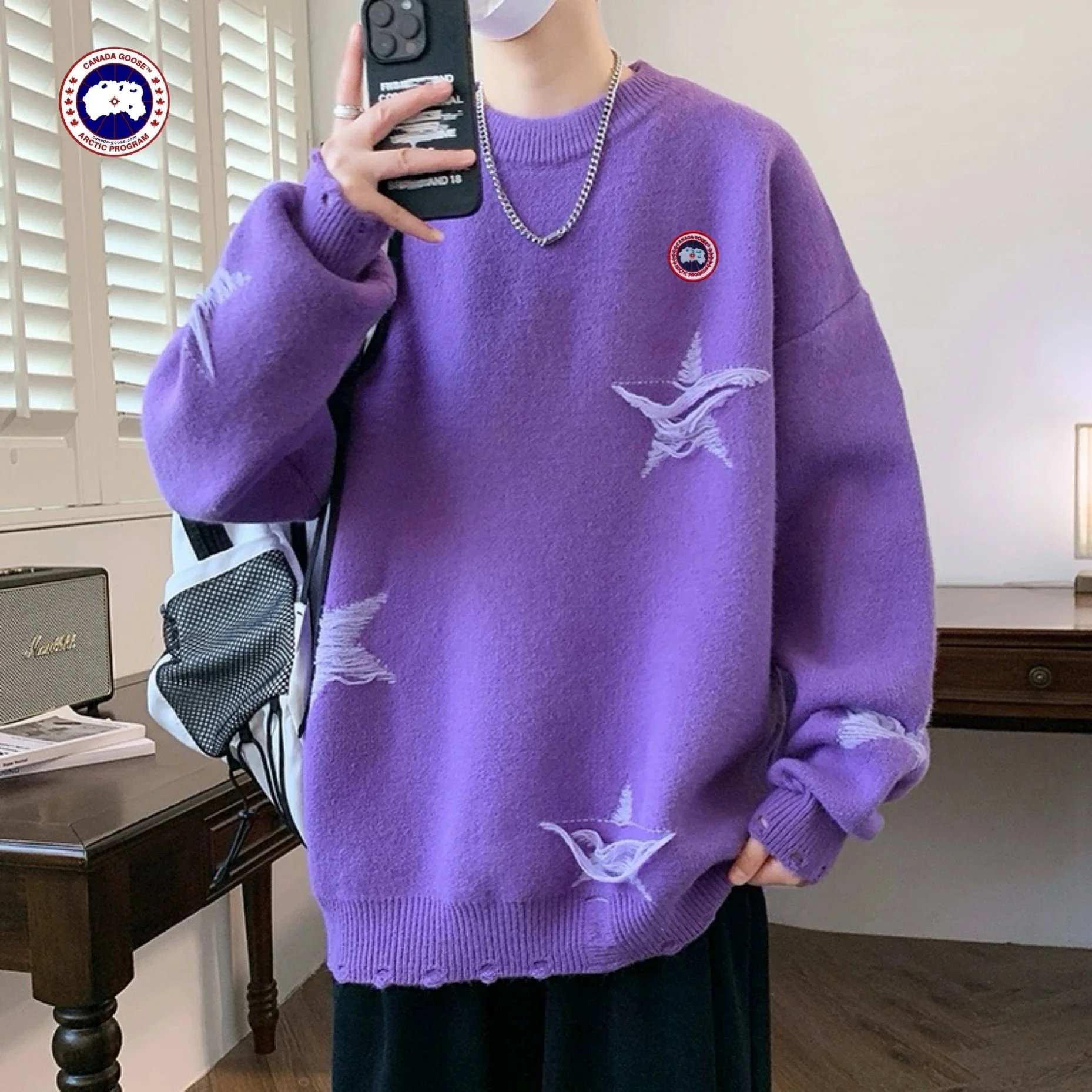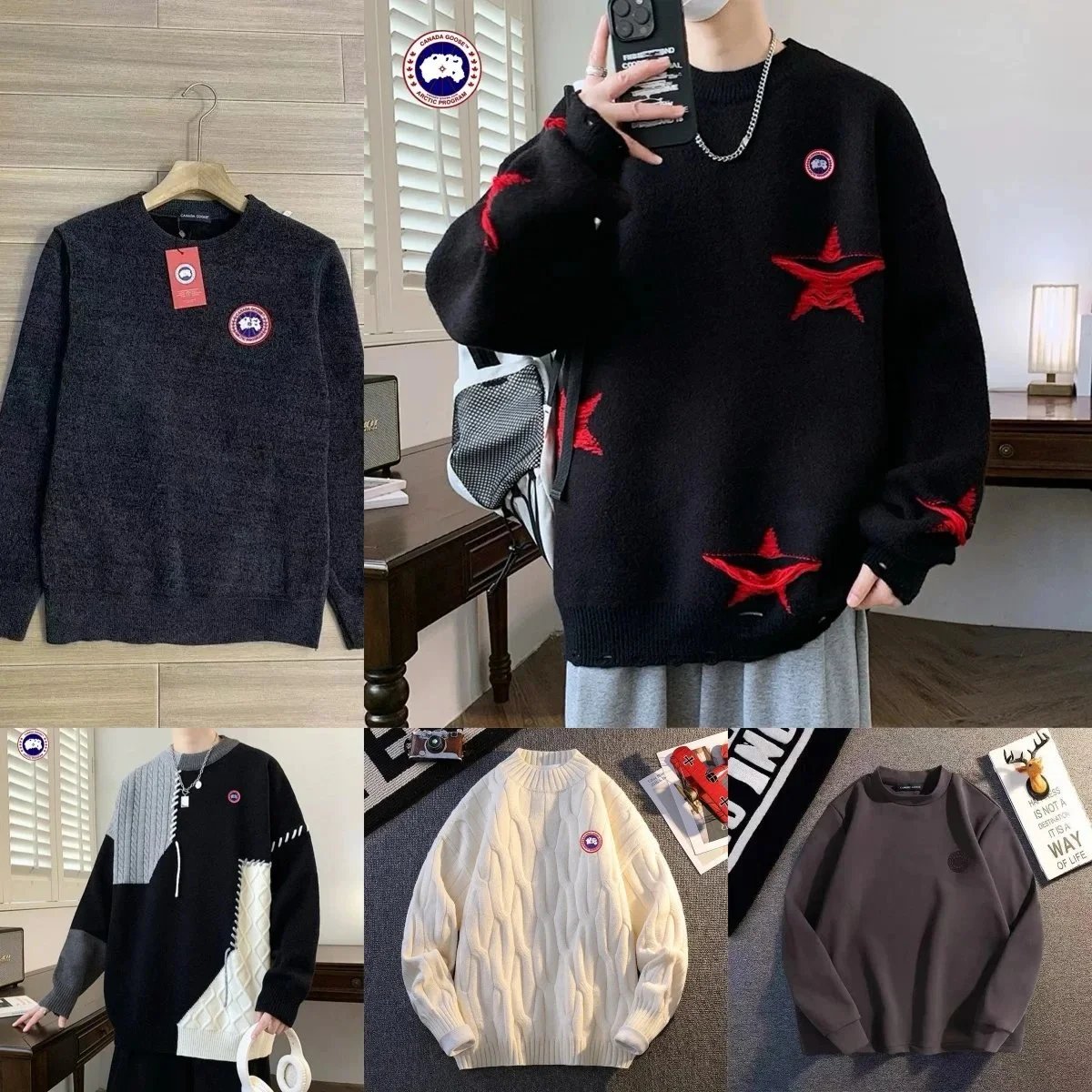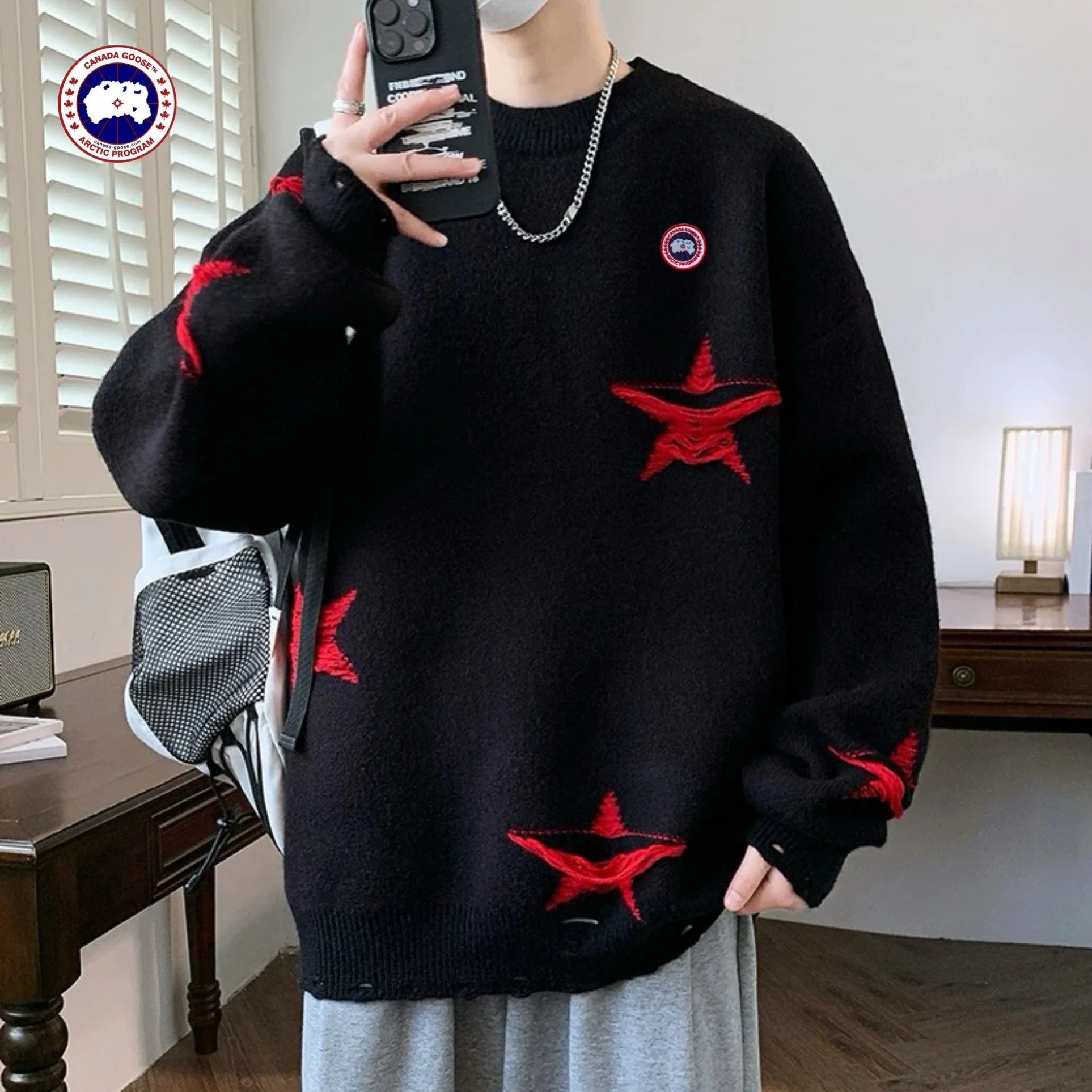 Stay warm and stylish with this Canada Goose men’s knit sweater featuring bold red star embroidery and premium knit construction for everyday comfort.