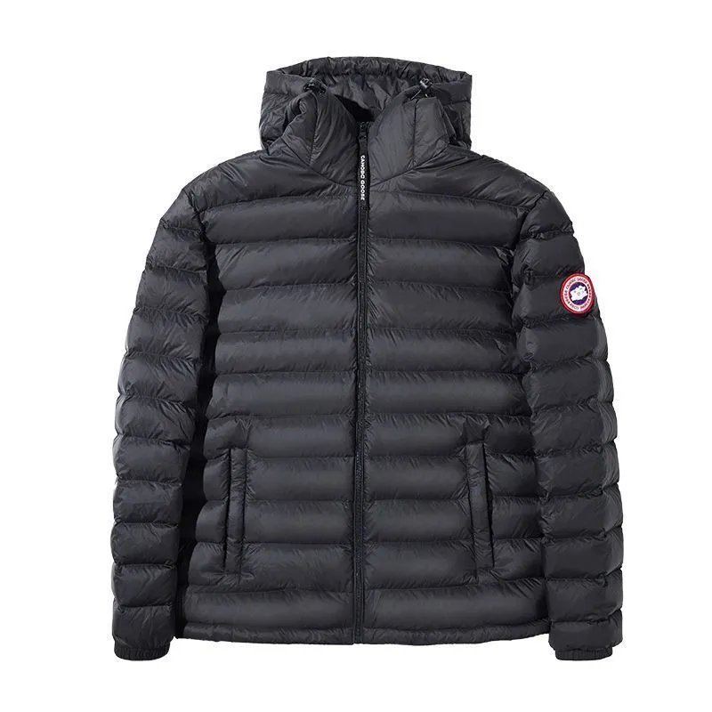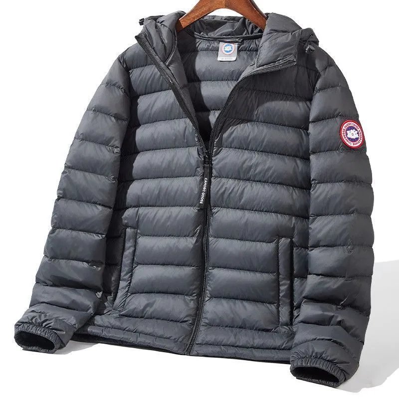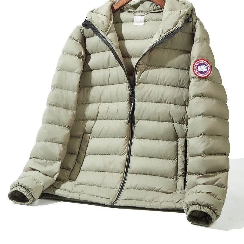 Premium Canada Goose white down jacket featuring a hood, front zipper closure, and signature logo patch. Designed for warmth and style in cold weather conditions.