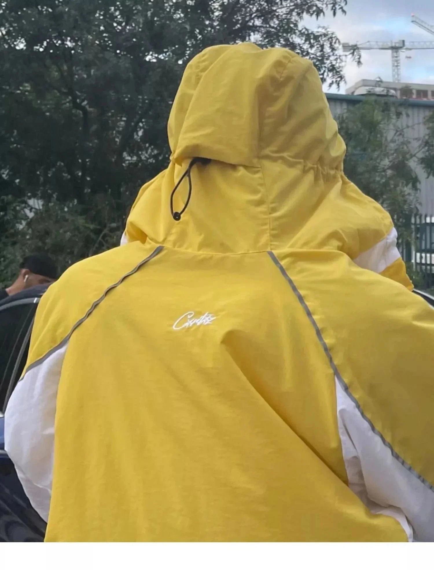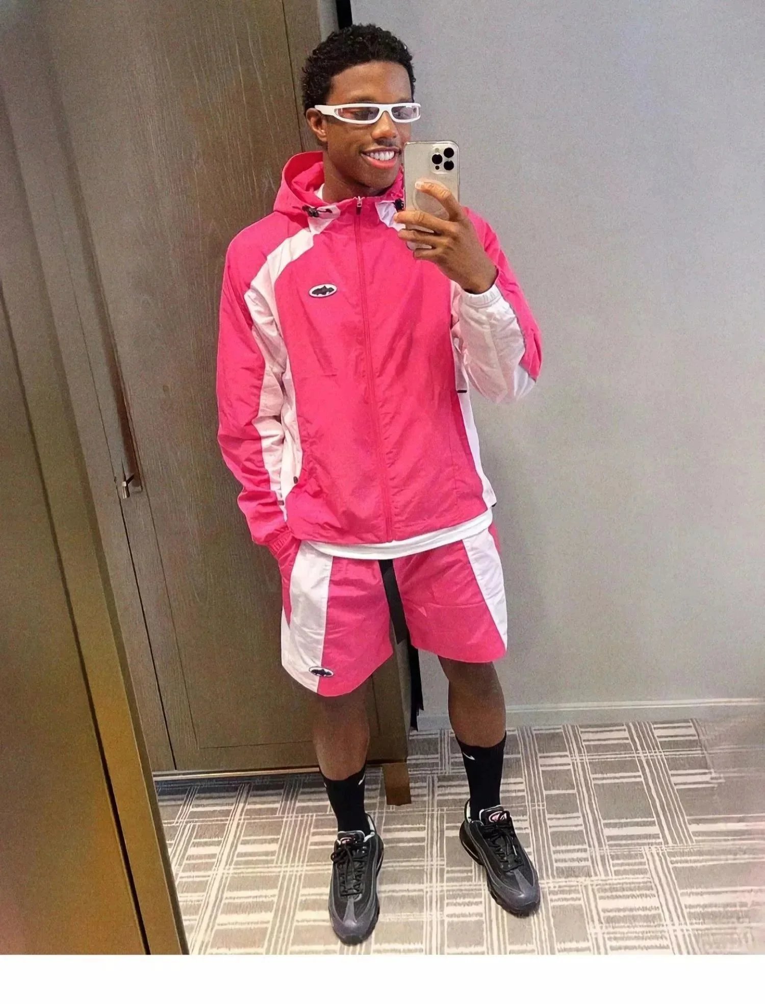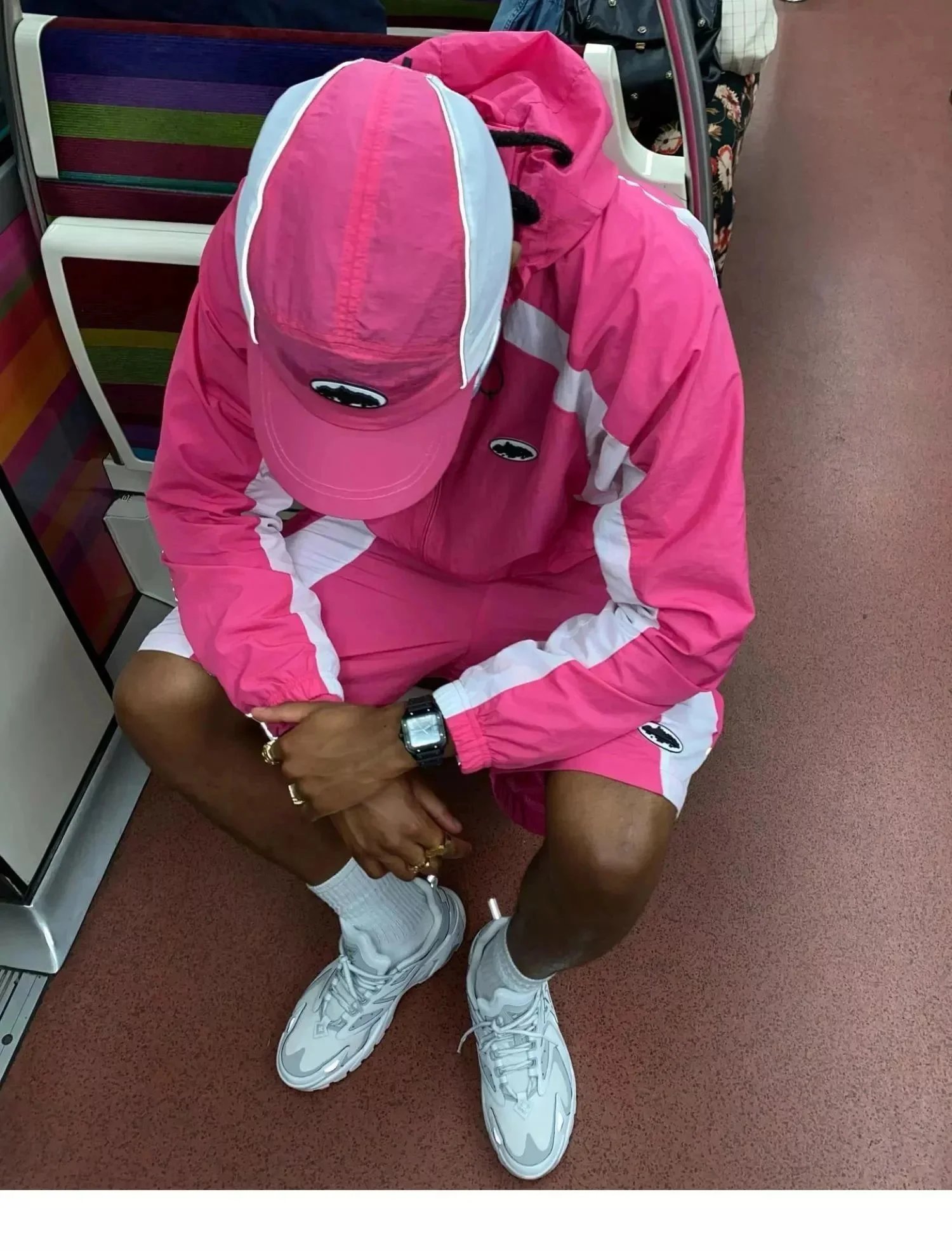 Stylish pink Carhartt hooded windbreaker jacket featuring reflective white stripes and a bold design perfect for urban outdoor adventures.