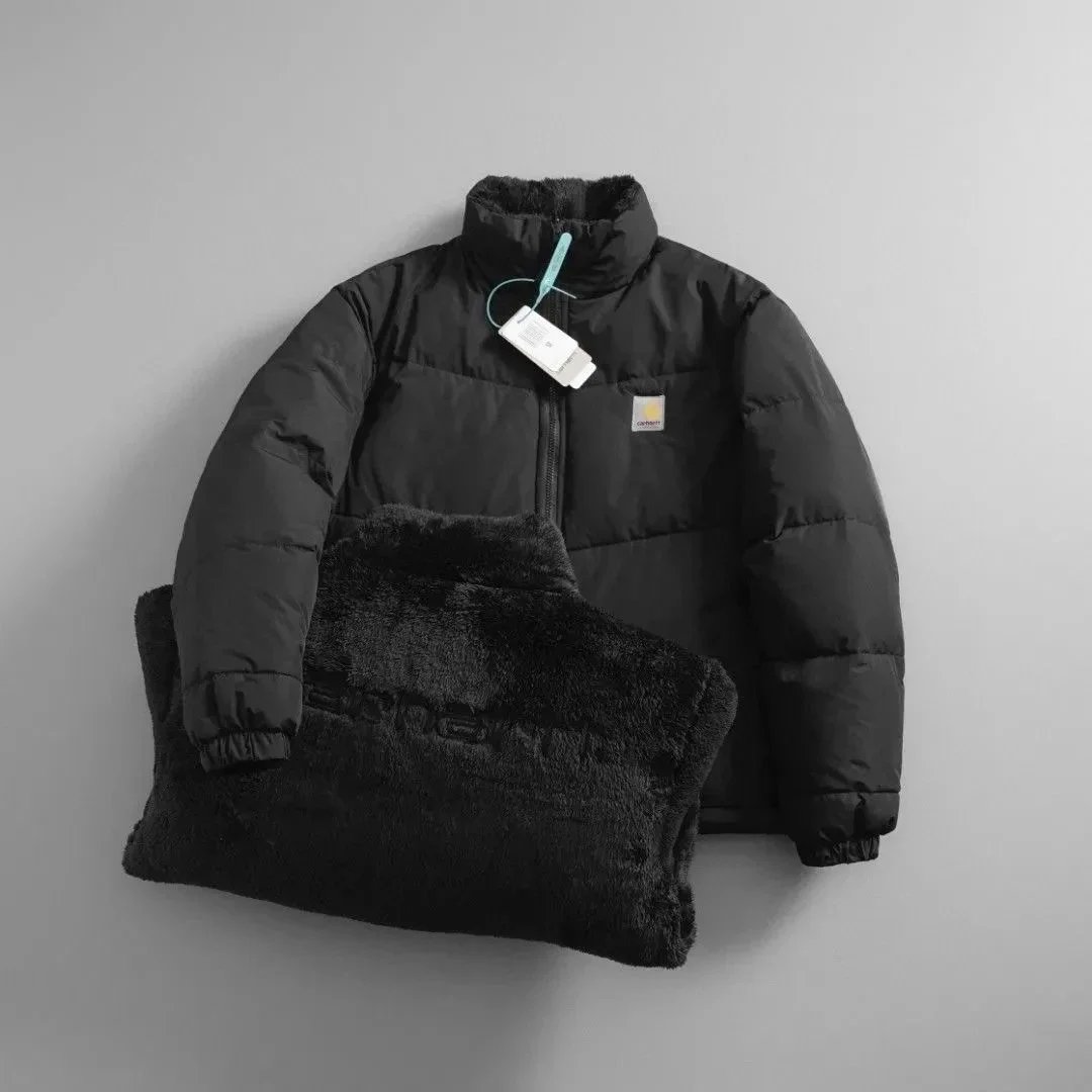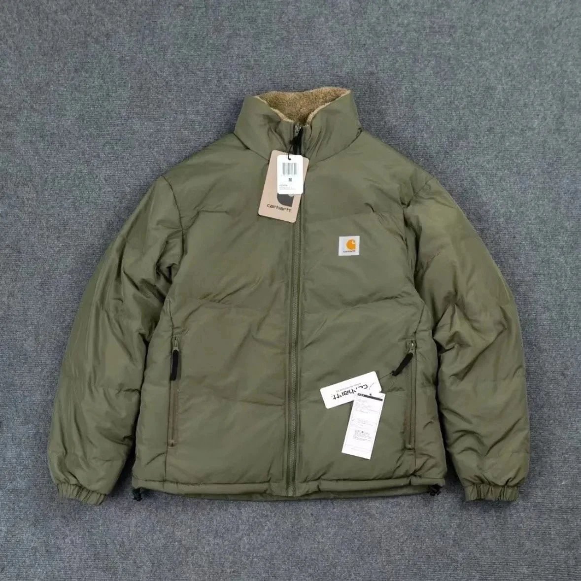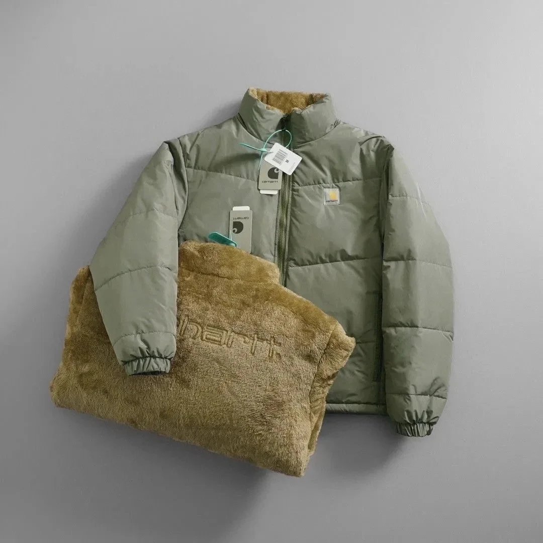 A versatile reversible puffer jacket from Carhartt featuring olive and brown sides with soft fleece lining. Ideal for cold weather with dual styling options.