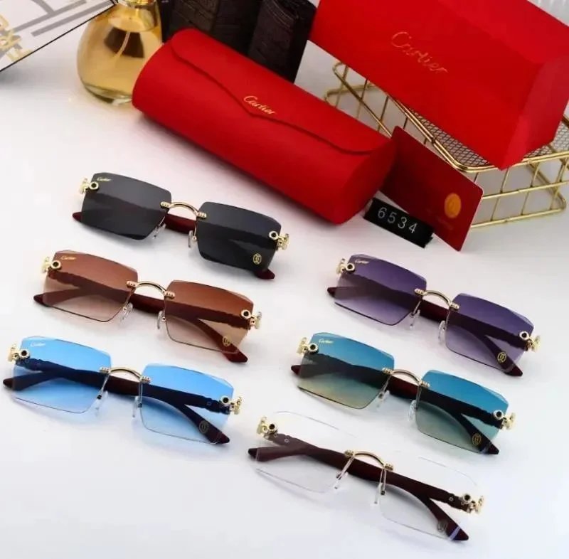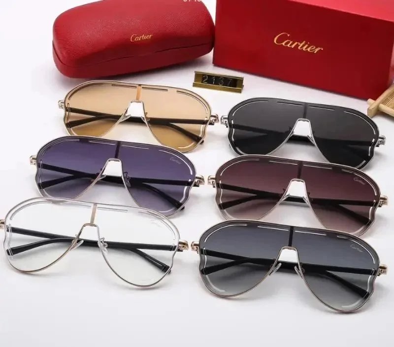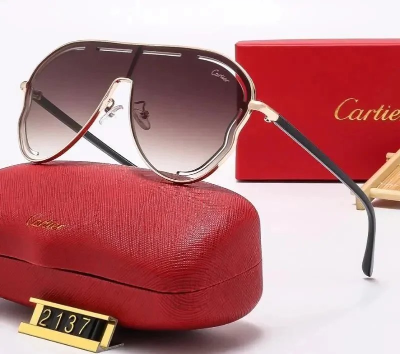 Elegant Cartier sunglasses featuring iconic gold cross detailing on red acetate frames. Available in multiple lens colors for a bold, luxurious look.