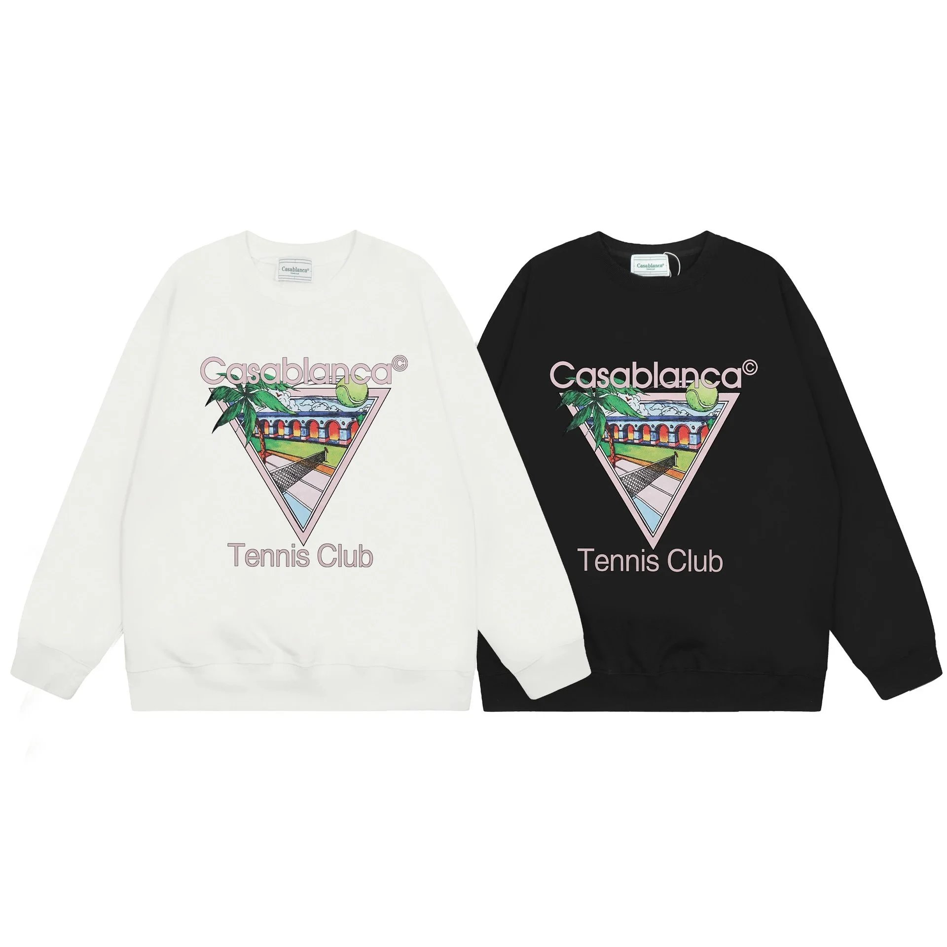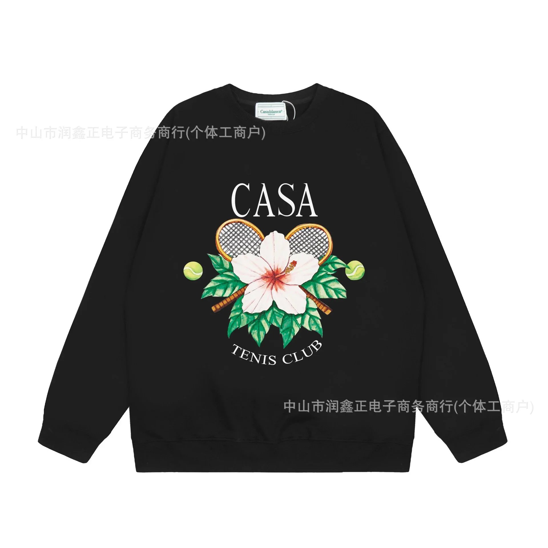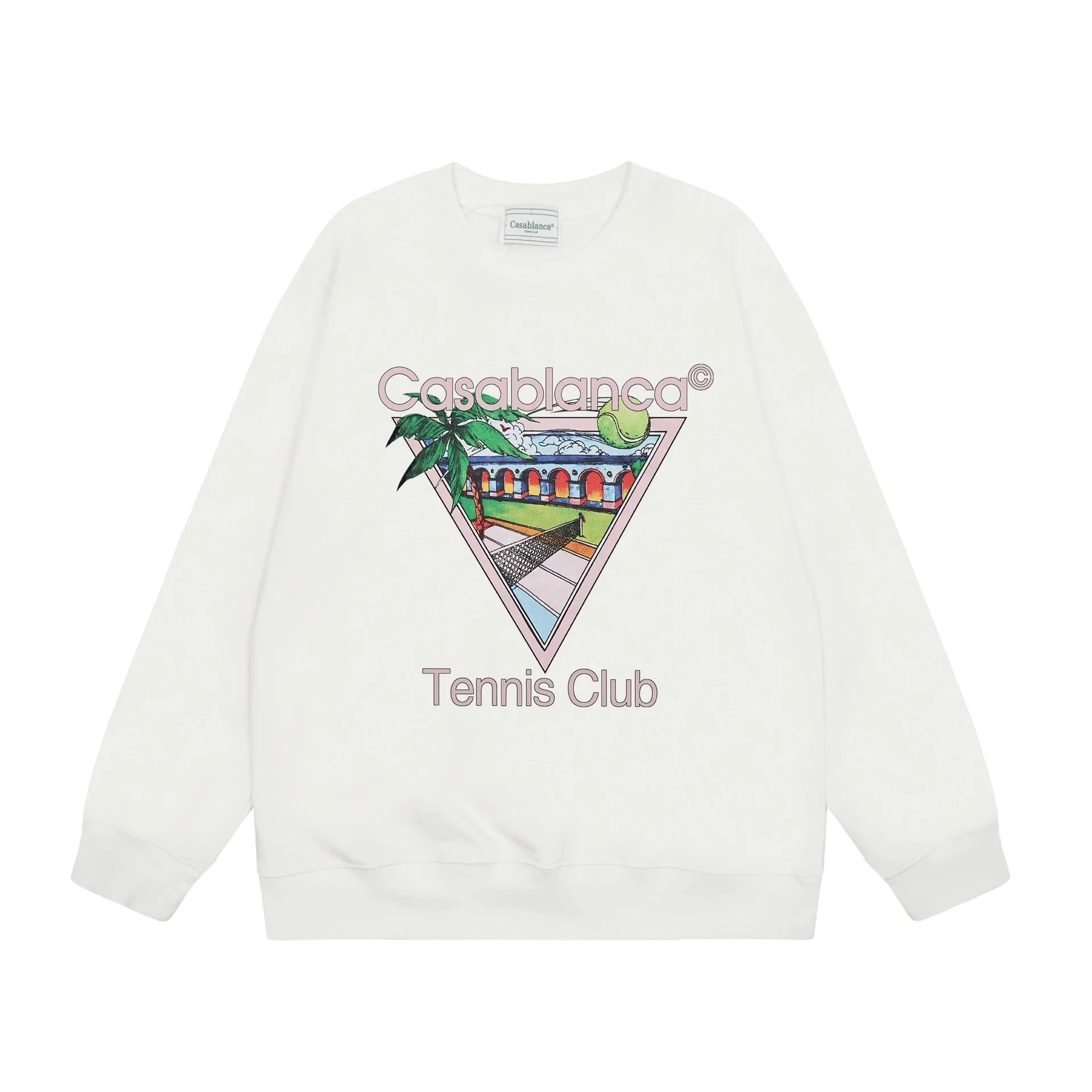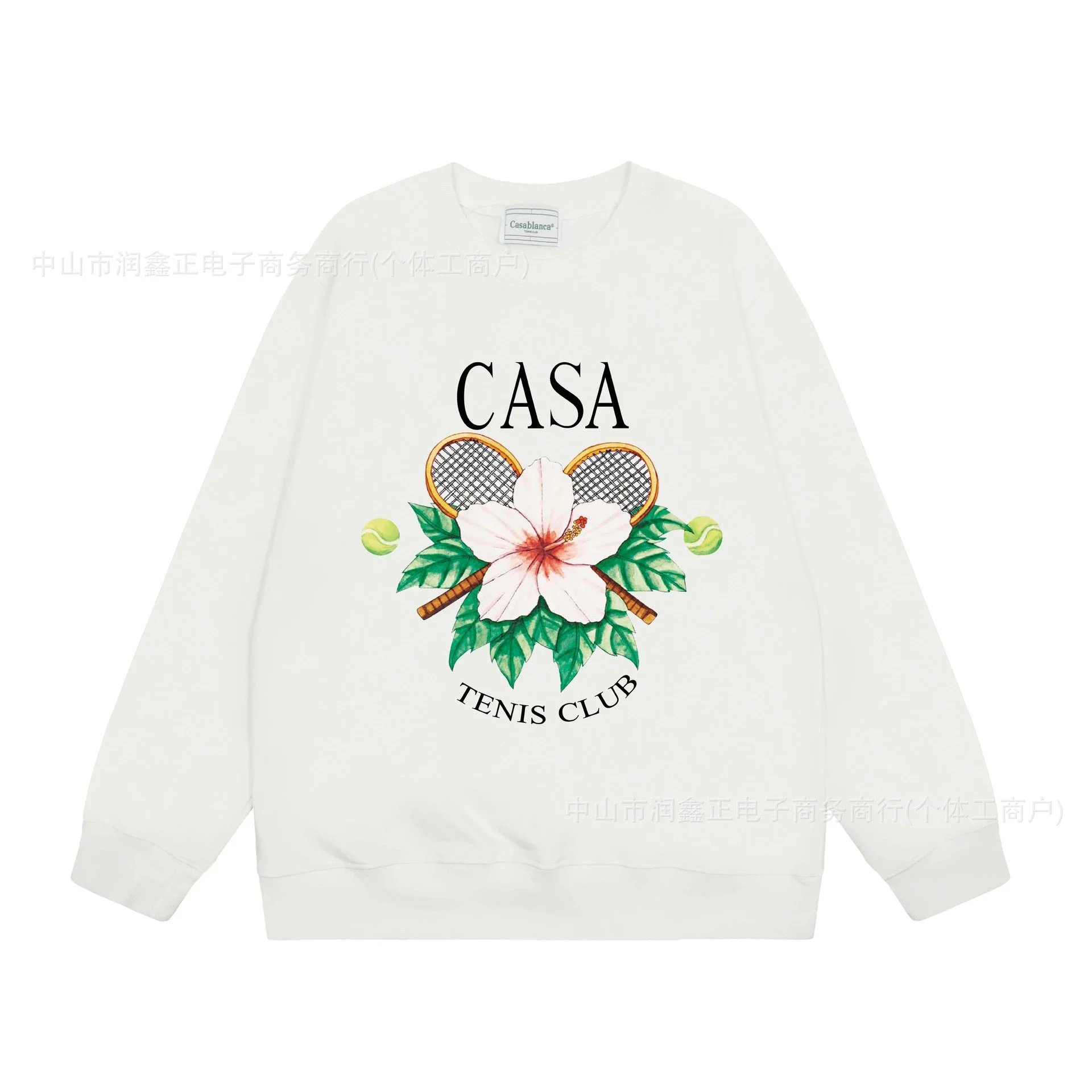Stylish Casa Tennis Club sweatshirt featuring a vibrant floral and racket print. Available in classic white and black for a bold, sporty-chic look.
