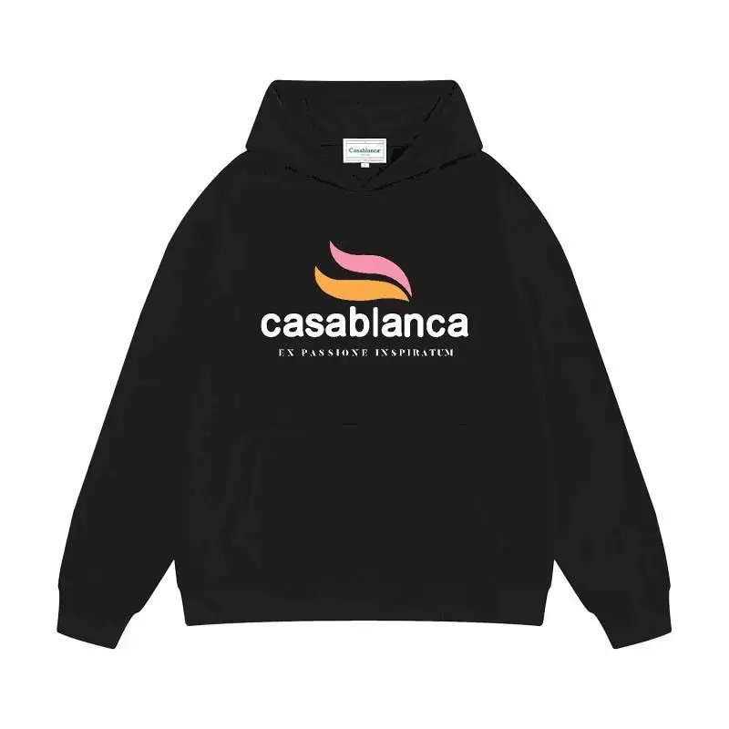 Elevate your wardrobe with this sleek black Casablanca hoodie featuring a vibrant logo and Latin tagline. Perfect for casual or streetwear styles.