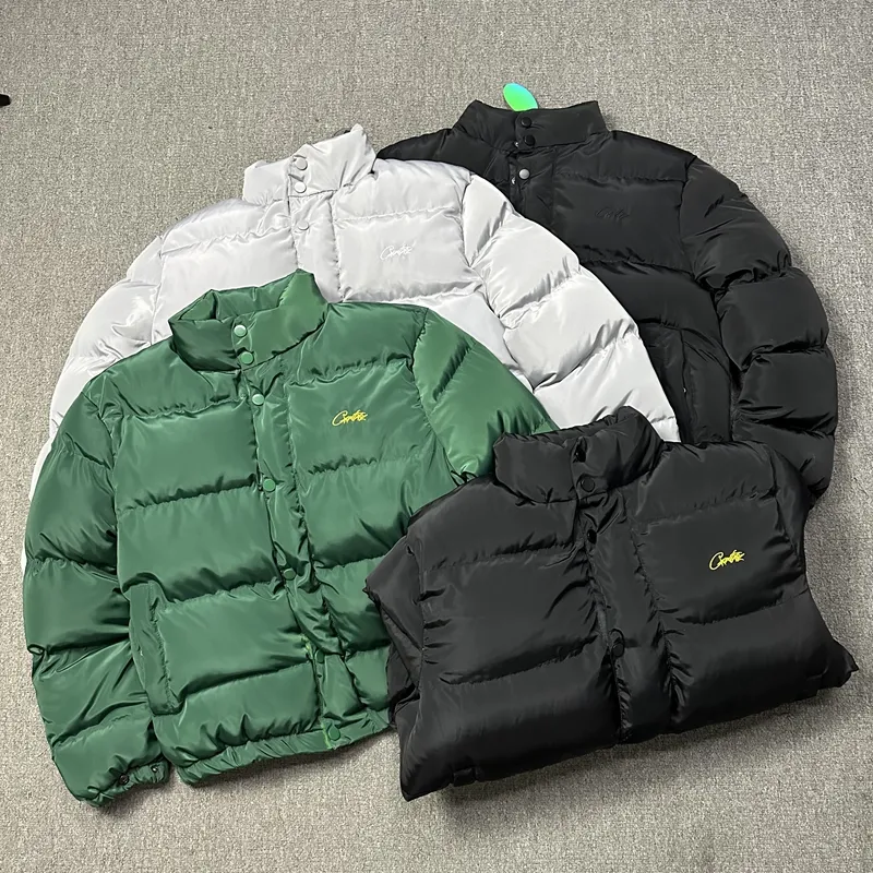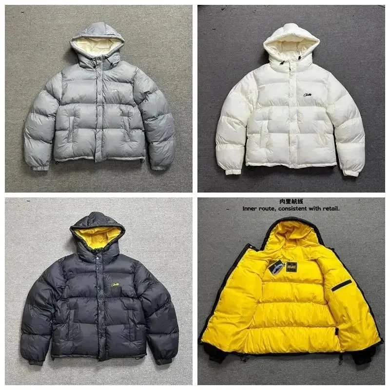 Stylish and warm Cate puffer jackets with hooded design, available in multiple colors including white, black, green, and yellow lining. Perfect for winter layering and outdoor activities.