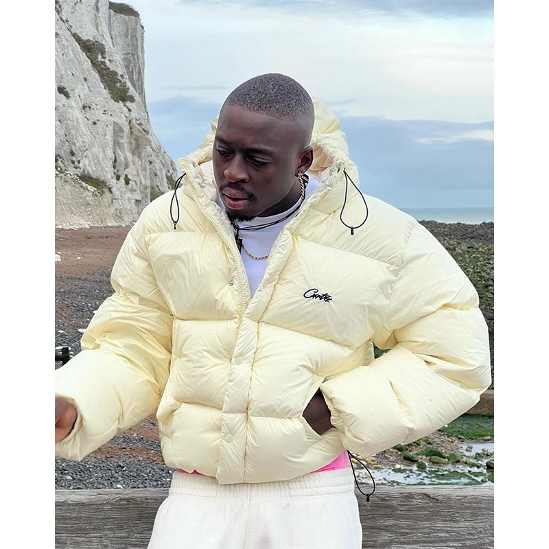 Stylish and warm Cayler & Sons grey puffer jacket with a hood, perfect for cold weather. Designed for comfort and urban fashion.