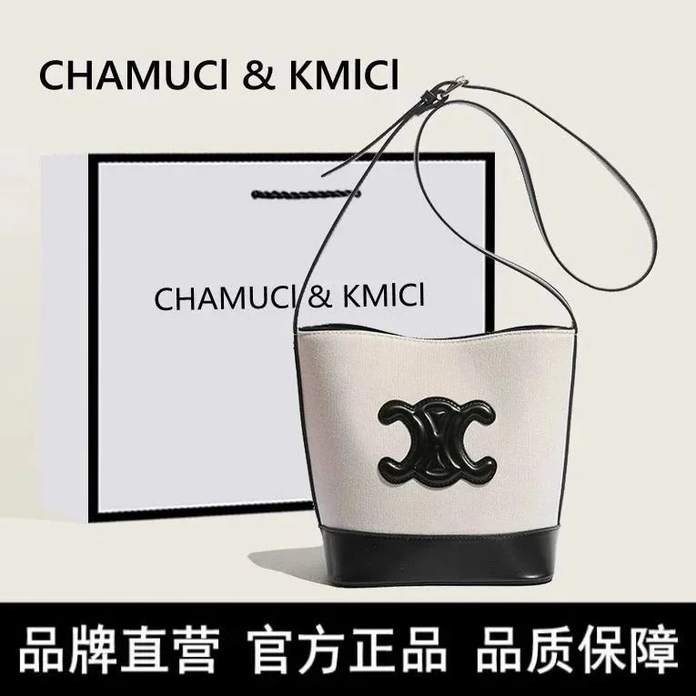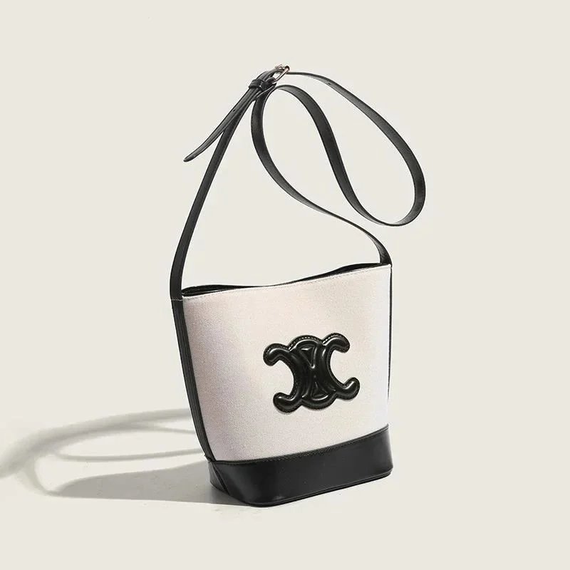 Elegant Celine bucket bag in black and white canvas with glossy black logo clasp and leather trim. Features a long adjustable shoulder strap for versatile wear.
