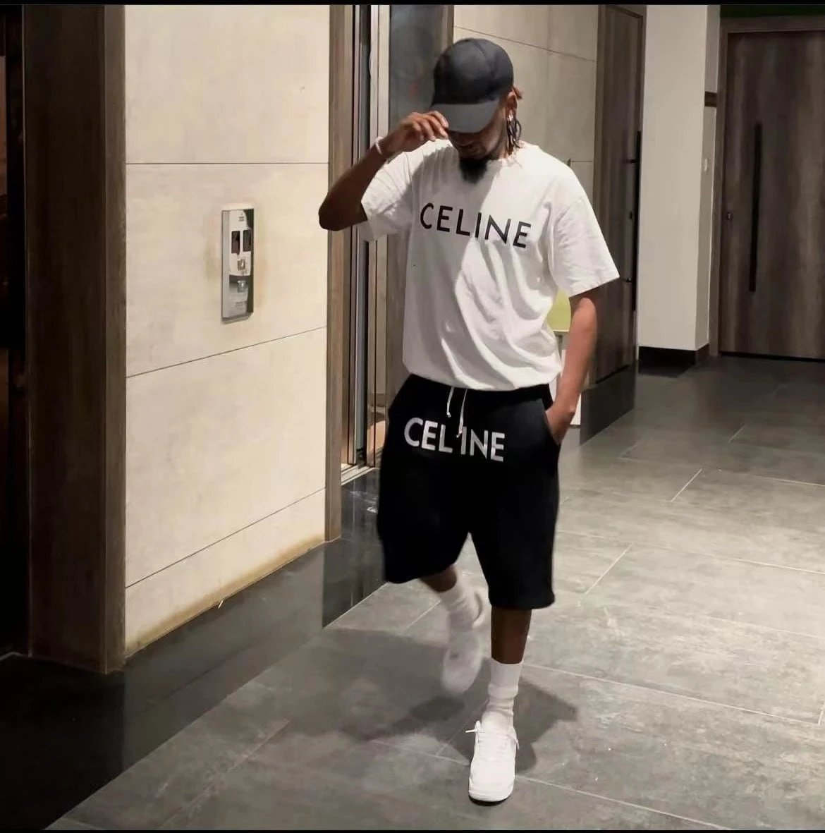 Stylish Celine-branded t-shirt and shorts set in multiple colors for men. Featuring bold logo print on both top and bottom for a cohesive, high-end look. Ideal for casual or athleisure wear.