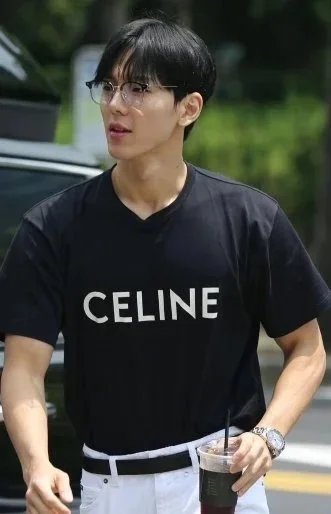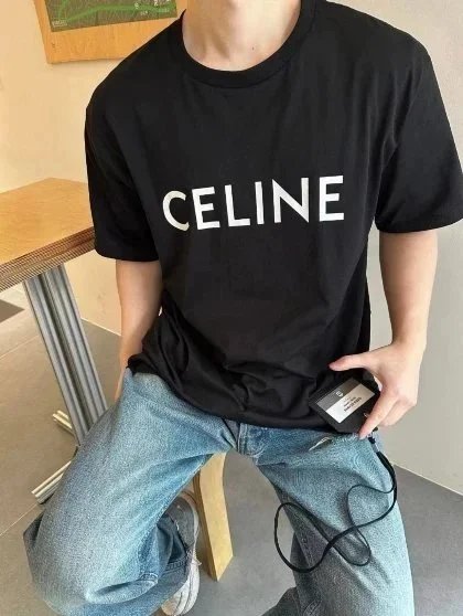 This Celine-branded oversized white t-shirt features bold lettering paired with textured crochet wide-leg pants for a chic, laid-back look. Ideal for casual outings or beachside style.