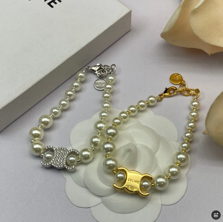 Elegant Celine pearl bracelets featuring gold and silver clasps with signature logo detailing. Perfect for adding a touch of luxury to any outfit.