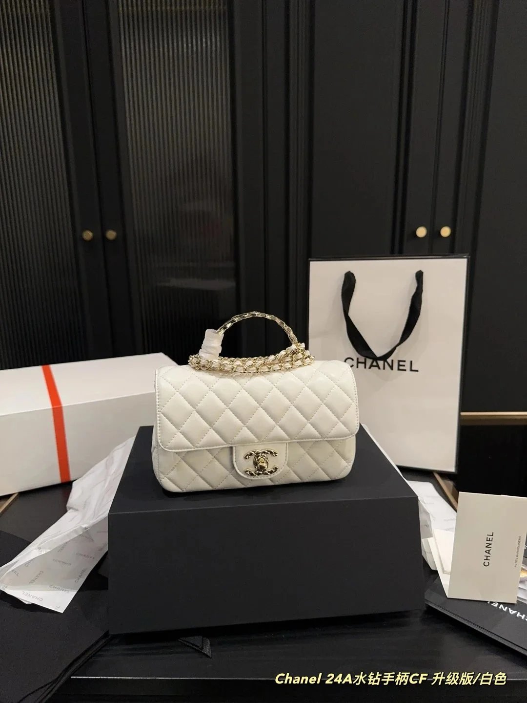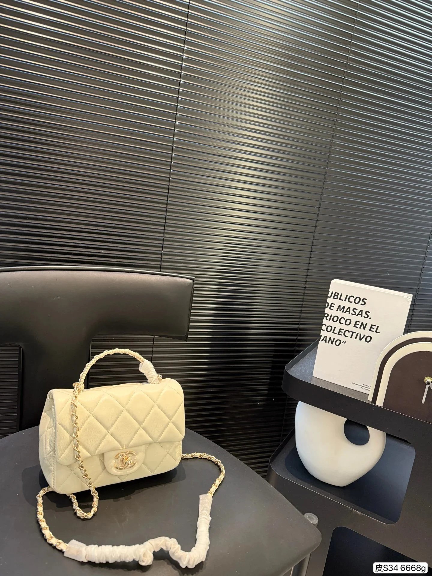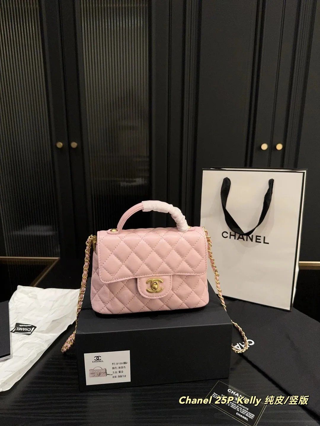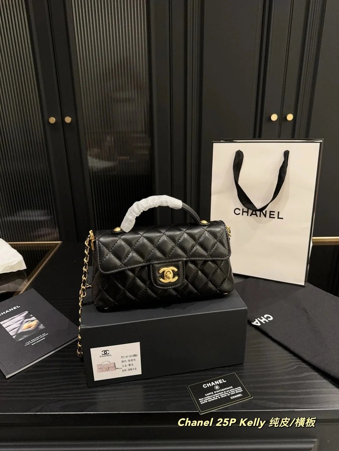 Elegant Chanel 25P Kelly handbag in creamy beige quilted leather with gold-tone hardware and chain strap. Displayed with authentic packaging for a premium luxury experience.