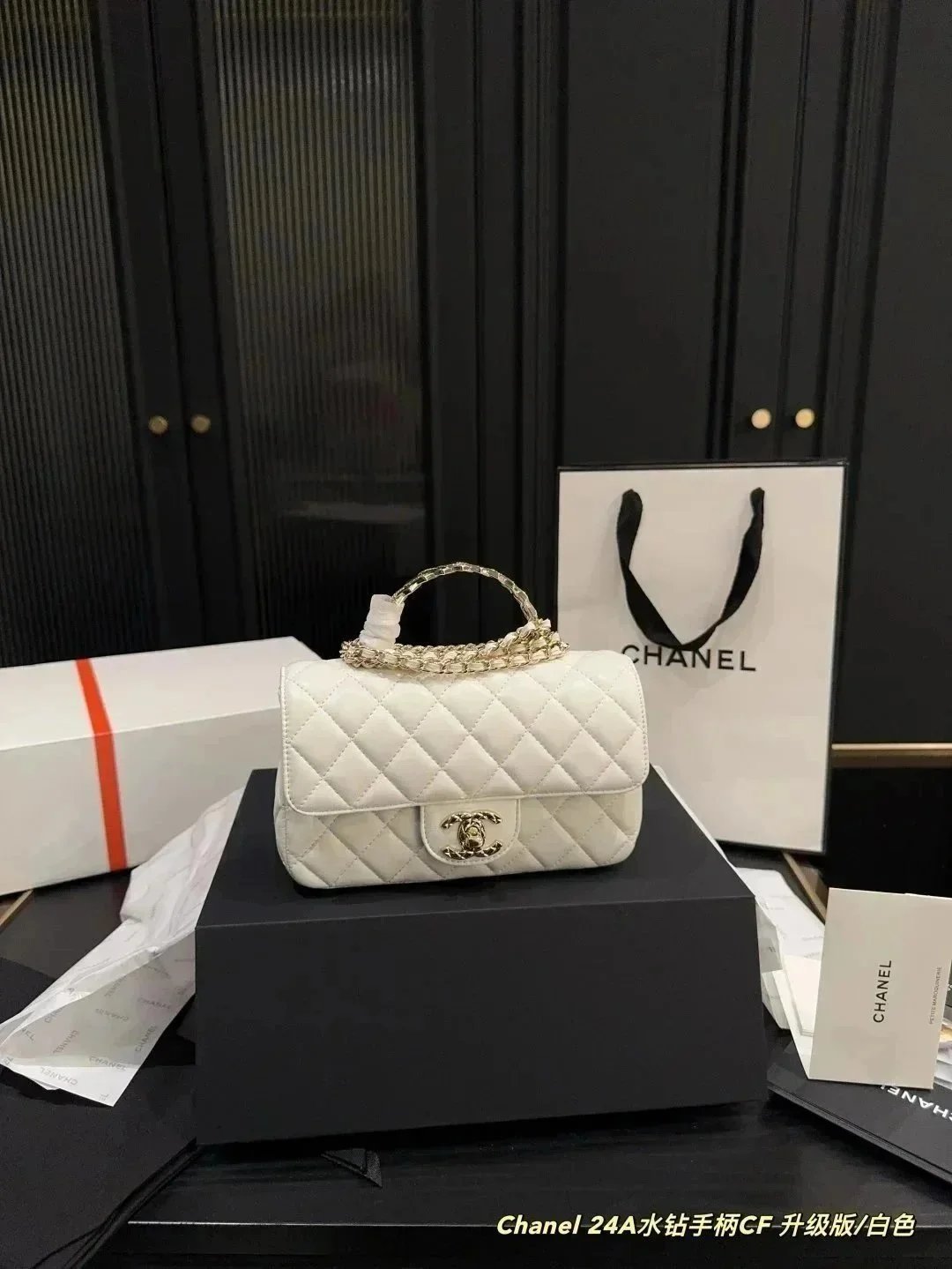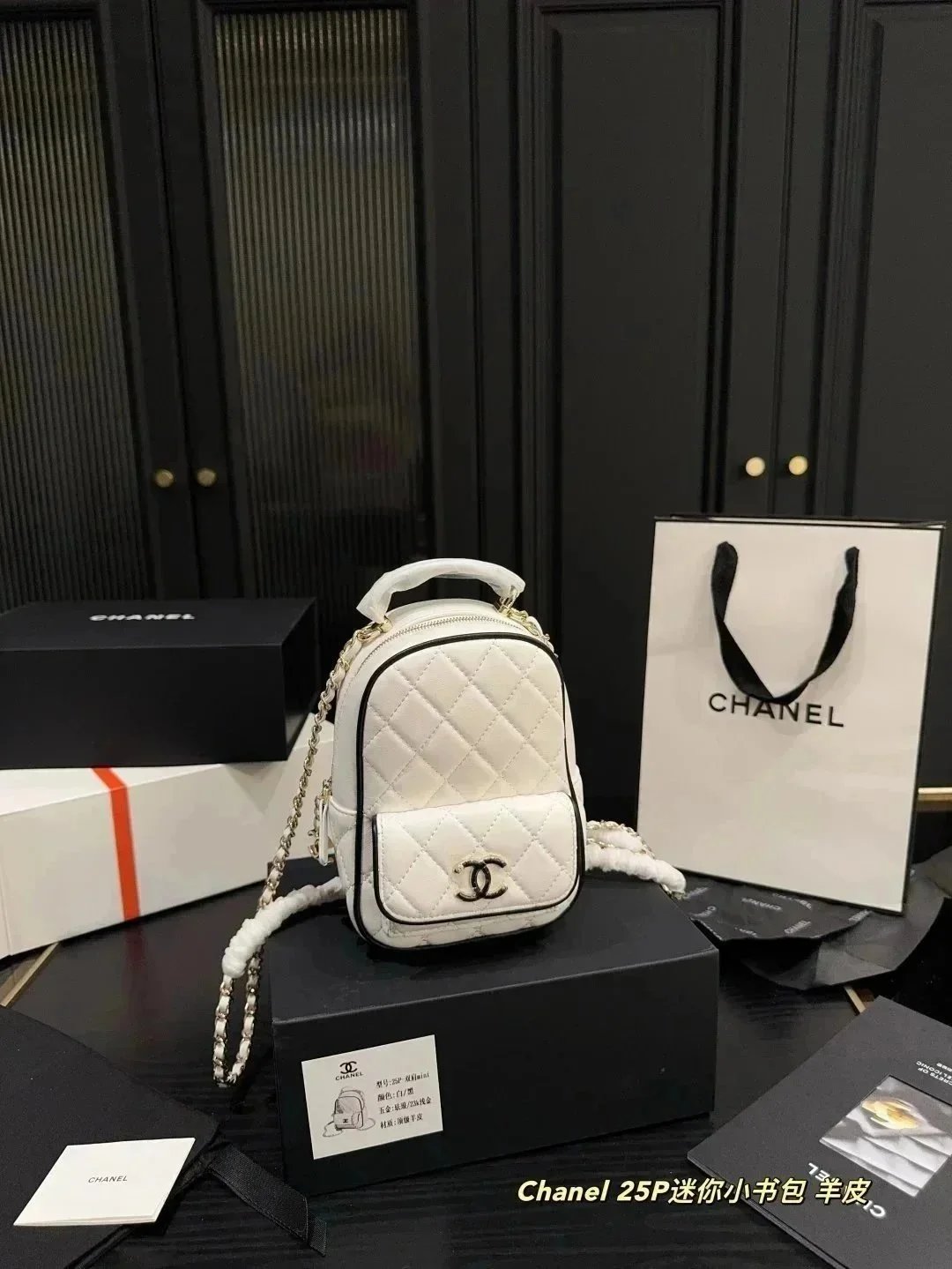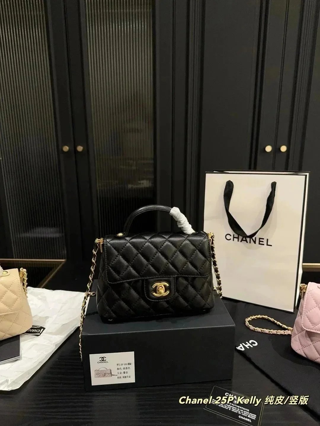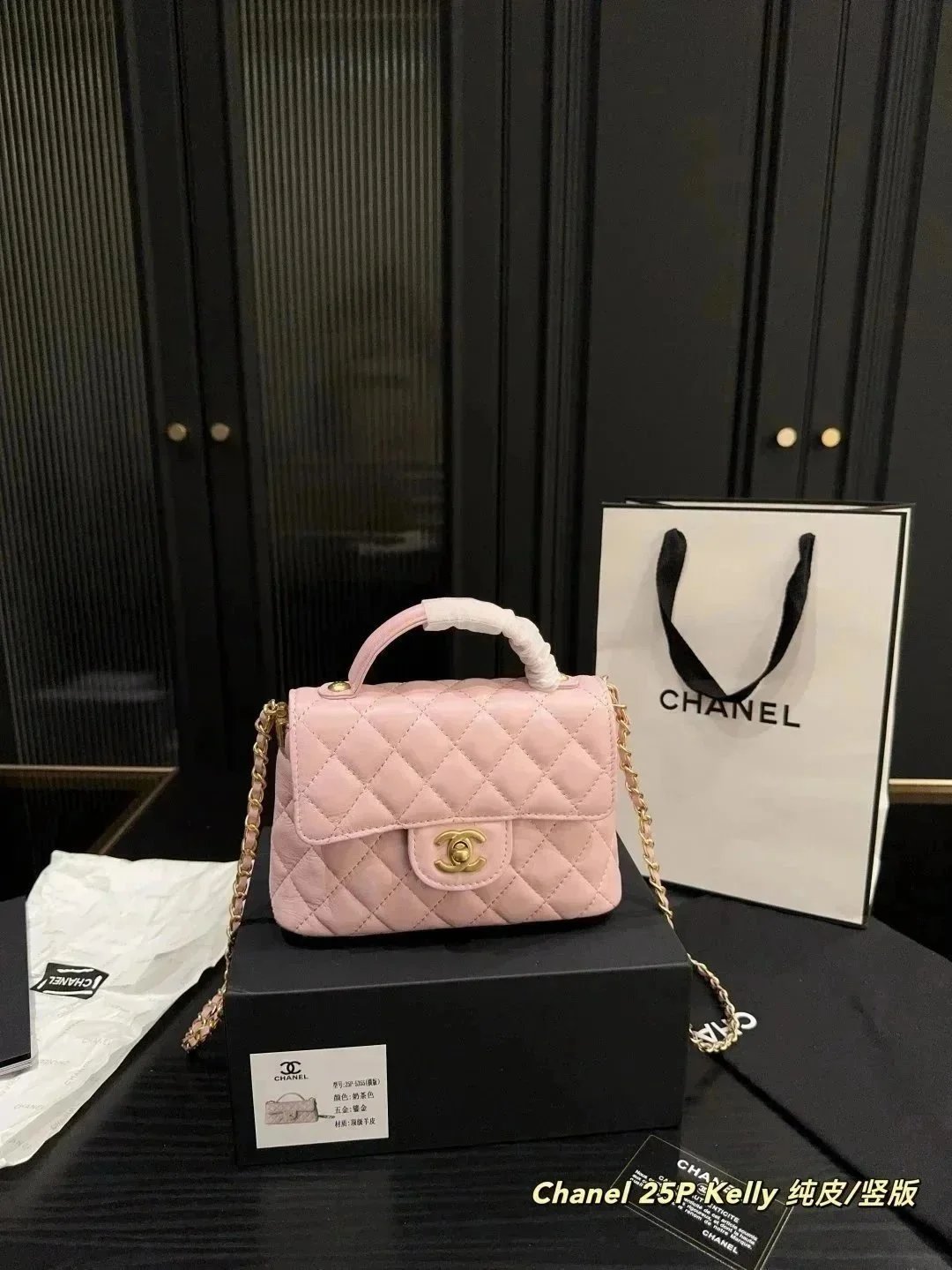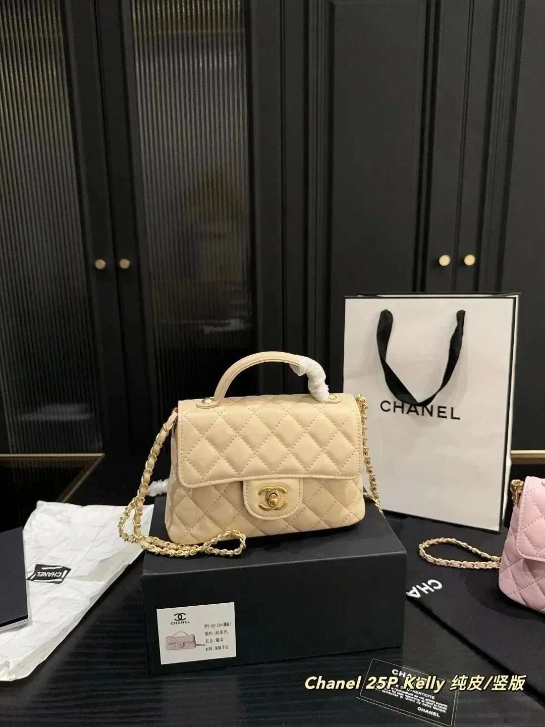 Elegant Chanel 25P Kelly handbag in beige quilted leather with gold-tone hardware and chain strap. Displayed with authentic packaging and documentation.