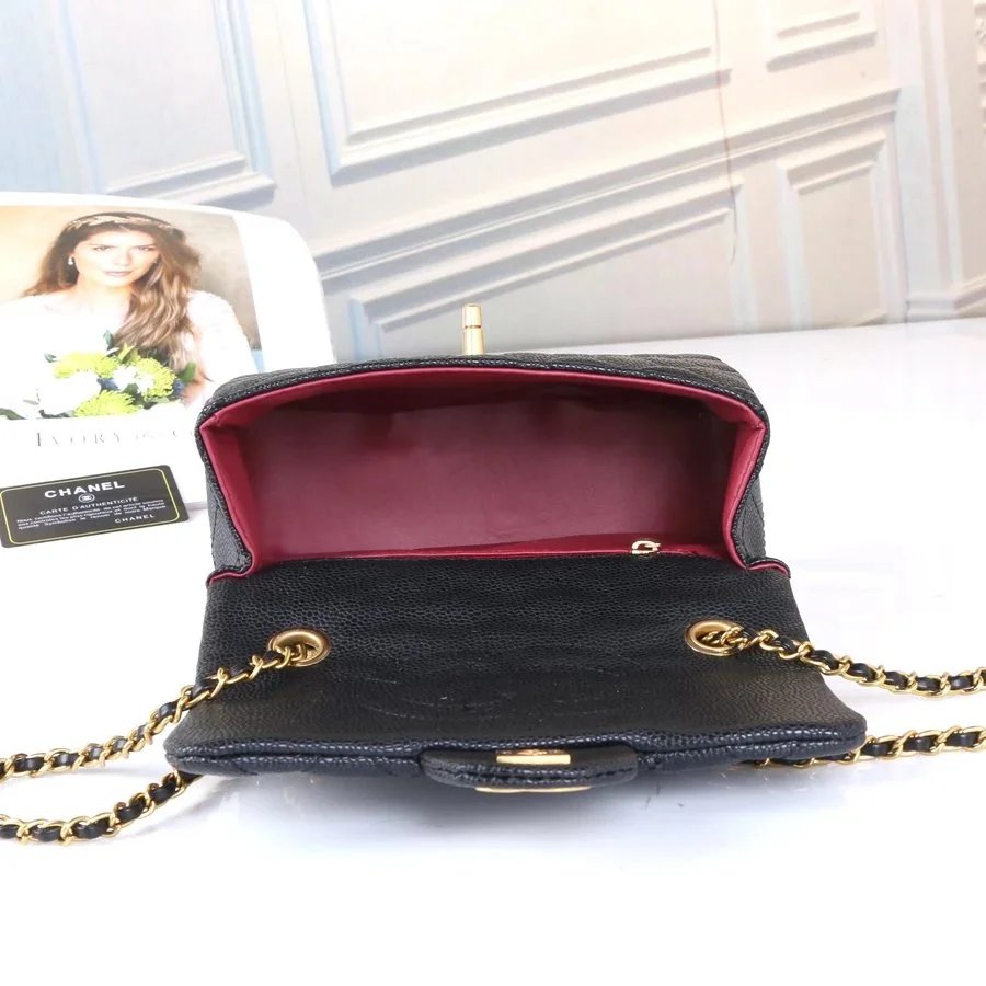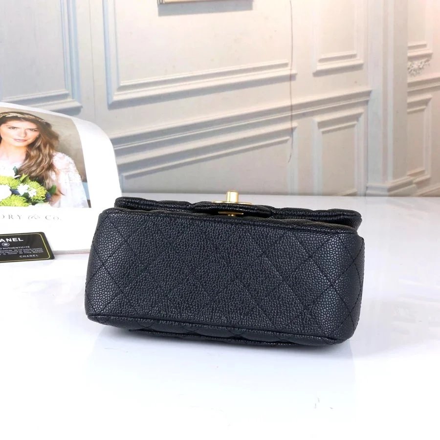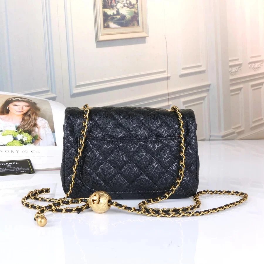 Elegant black quilted caviar leather Chanel flap bag featuring gold-tone hardware and a signature chain strap. Timeless design perfect for everyday luxury.