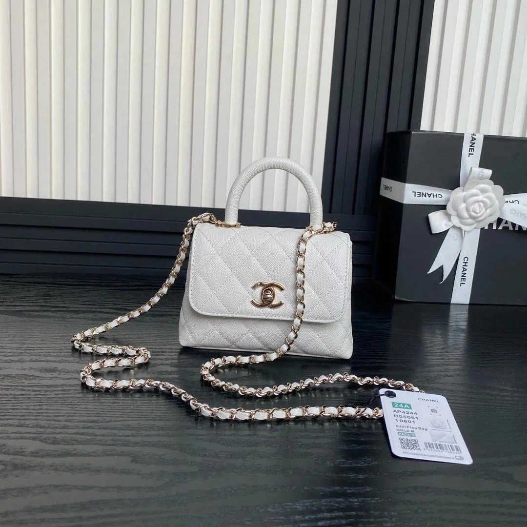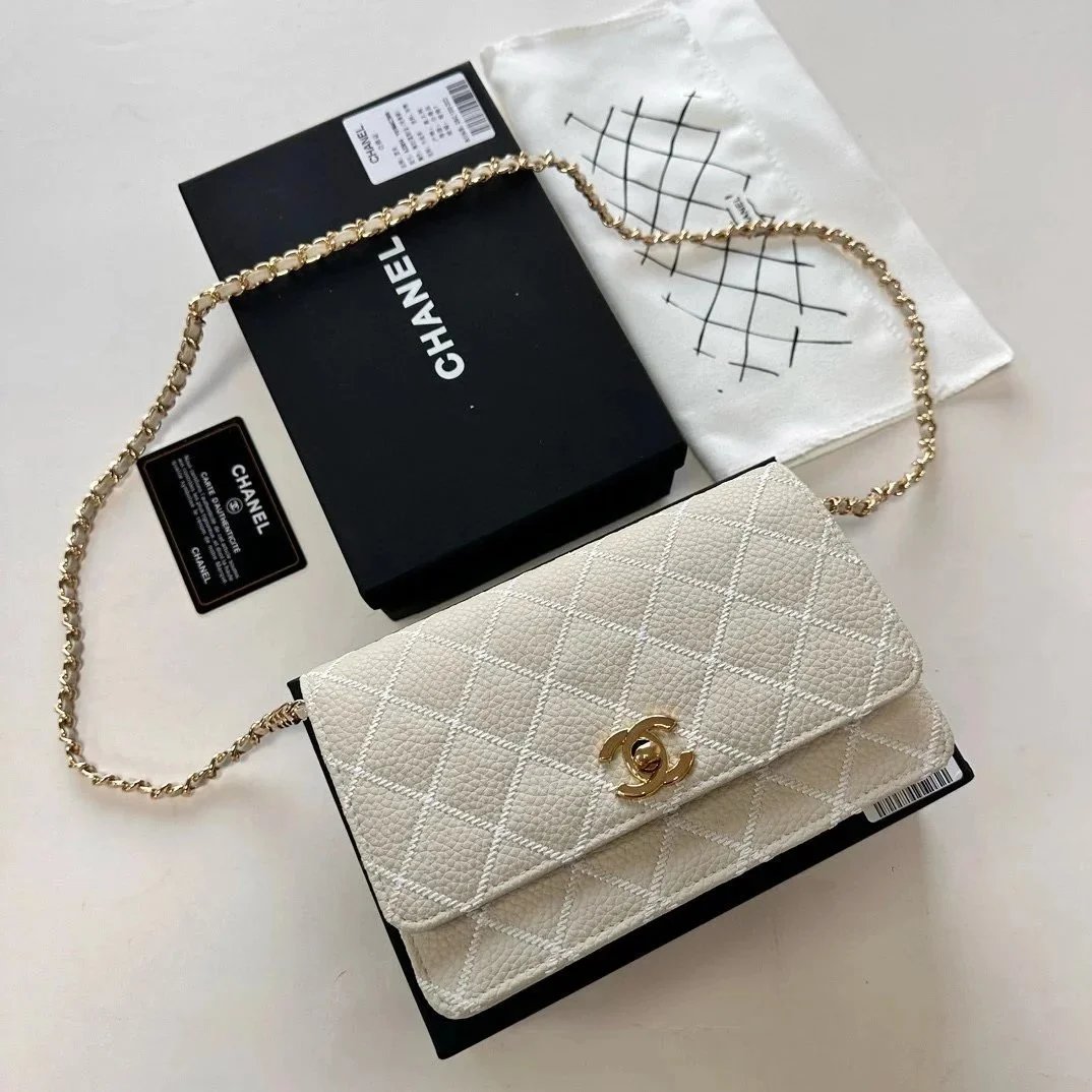 Elegant silver quilted Chanel handbag featuring a signature chain handle and iconic CC logo. Perfect for adding timeless sophistication to any outfit.