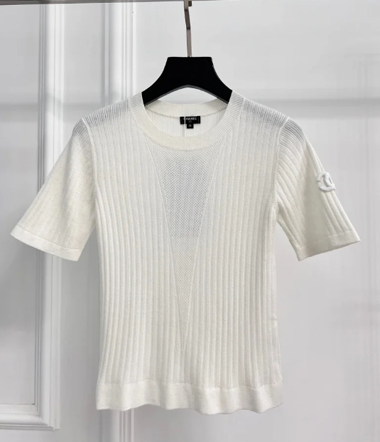 Elegant white Chanel t-shirt featuring a prominent embroidered interlocking CC logo. Ideal for casual luxury looks with iconic brand recognition.