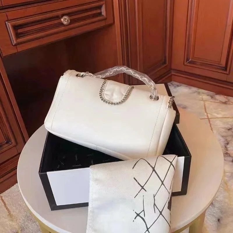 Elegant white quilted Chanel crossbody bag featuring a silver-tone chain strap and iconic CC logo. Perfect for timeless luxury style.