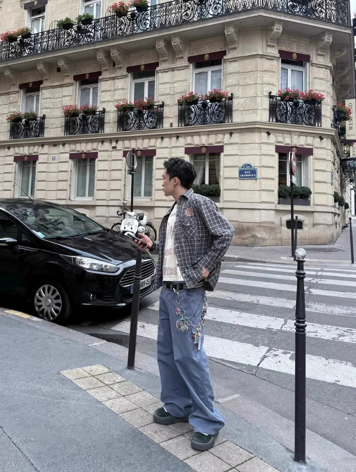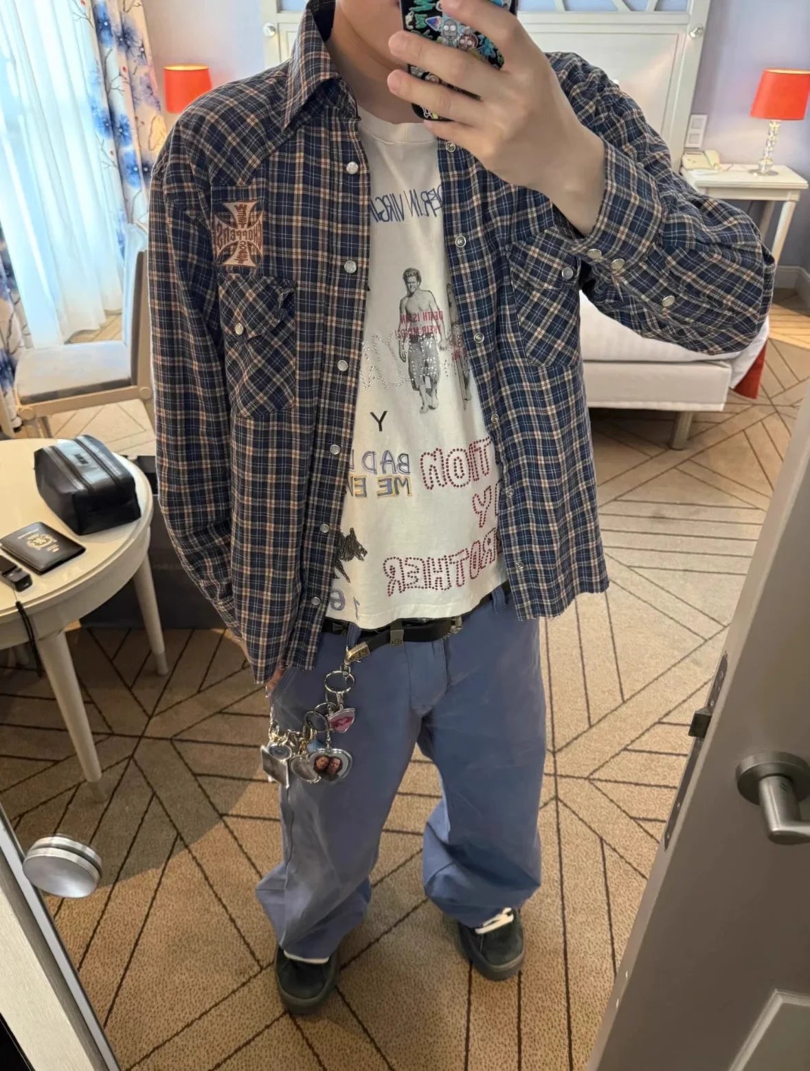 Durable blue and beige plaid button-up shirt featuring a distinctive Choppers logo patch on the chest. Designed for casual wear with classic western styling and functional front pockets.