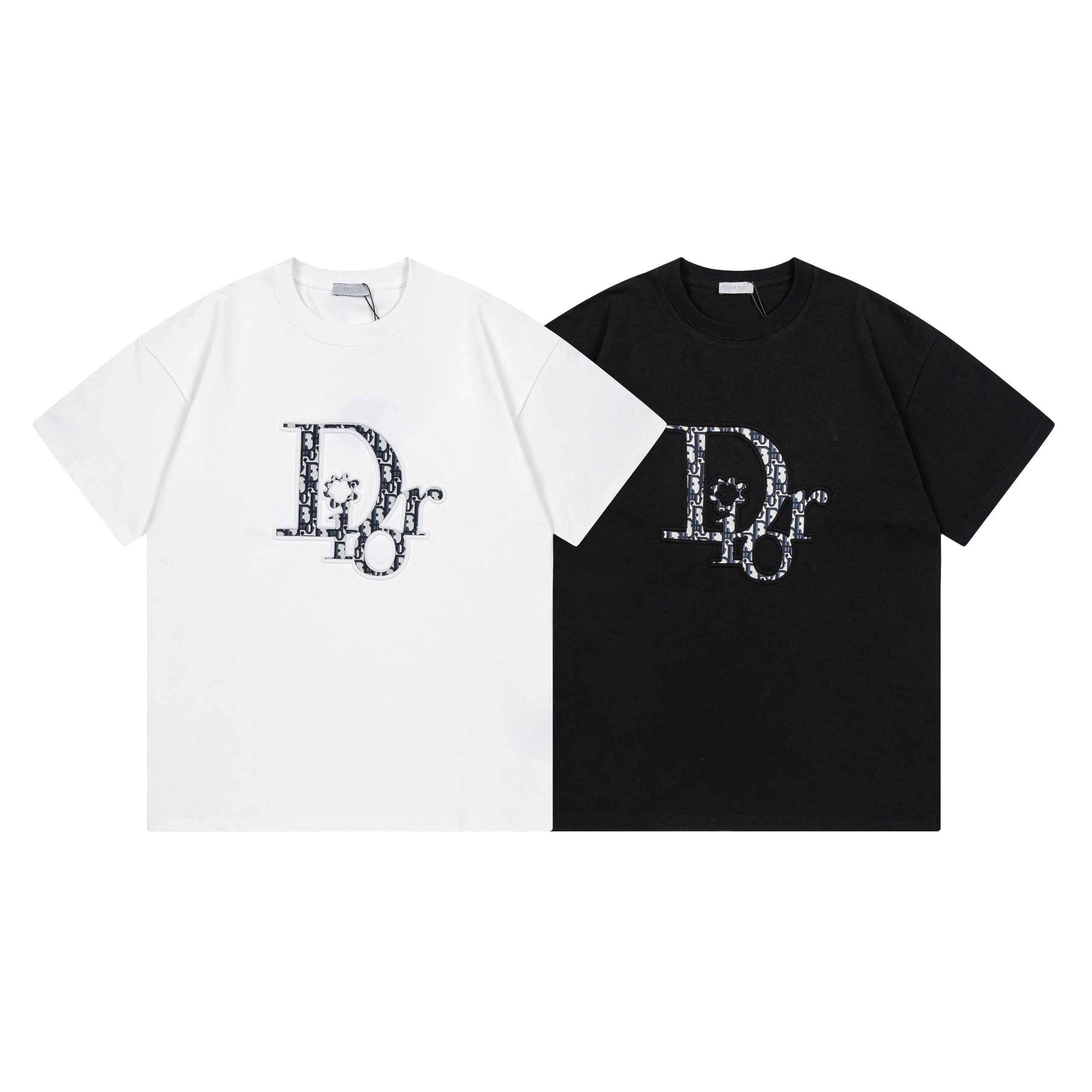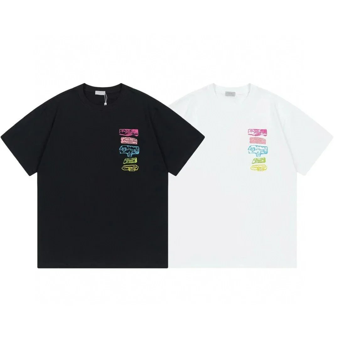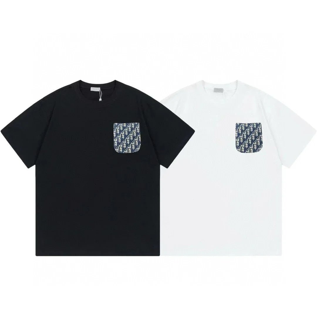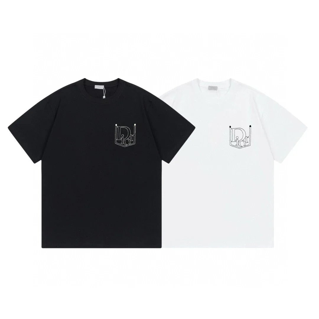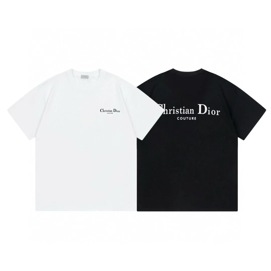 High-end Christian Dior Couture t-shirts in white and black featuring iconic logo patch and signature collar tape. Ideal for luxury casual wear.