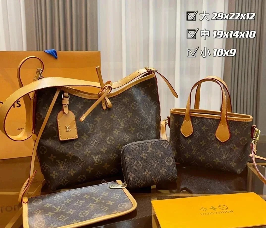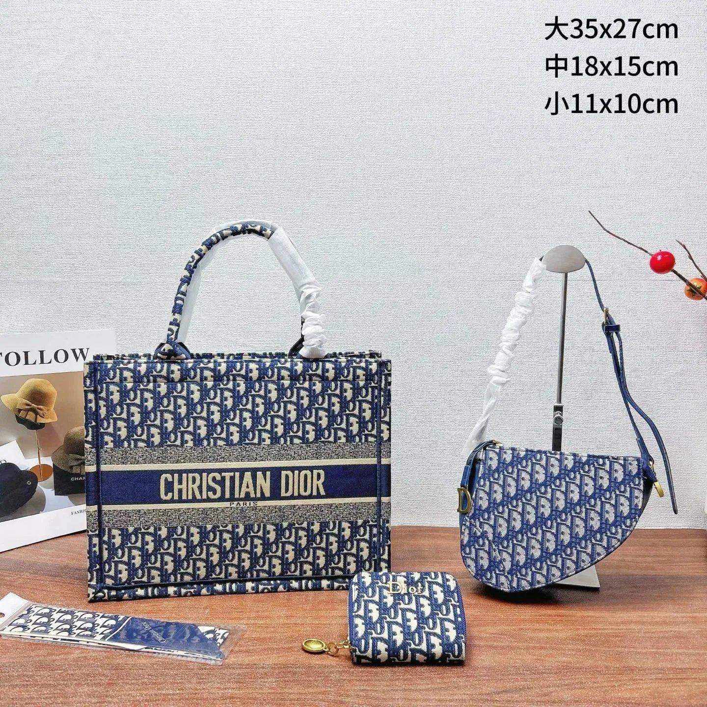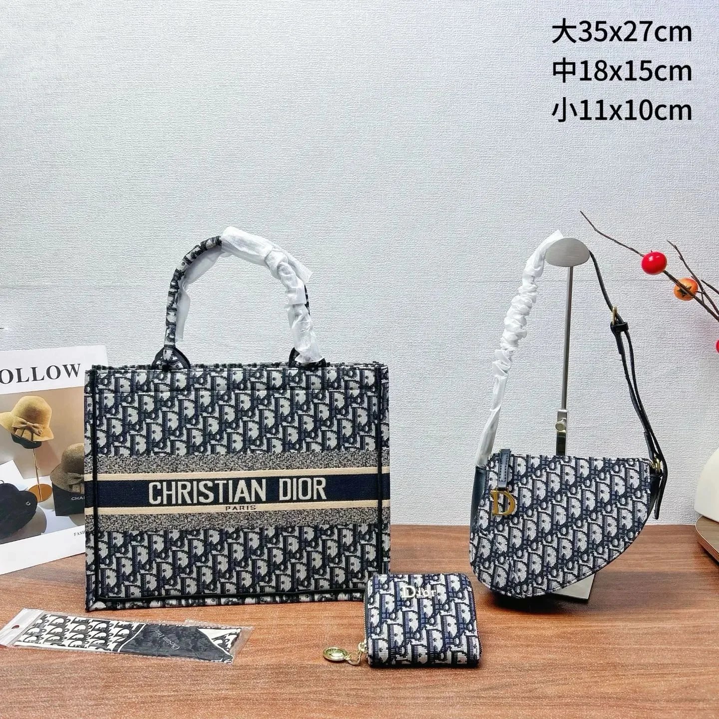 Elegant Christian Dior oblique print tote bag set featuring a large tote, crossbody bag, and coin purse in classic monogram patterns. Available in multiple colorways including pink, blue, gray, and black.