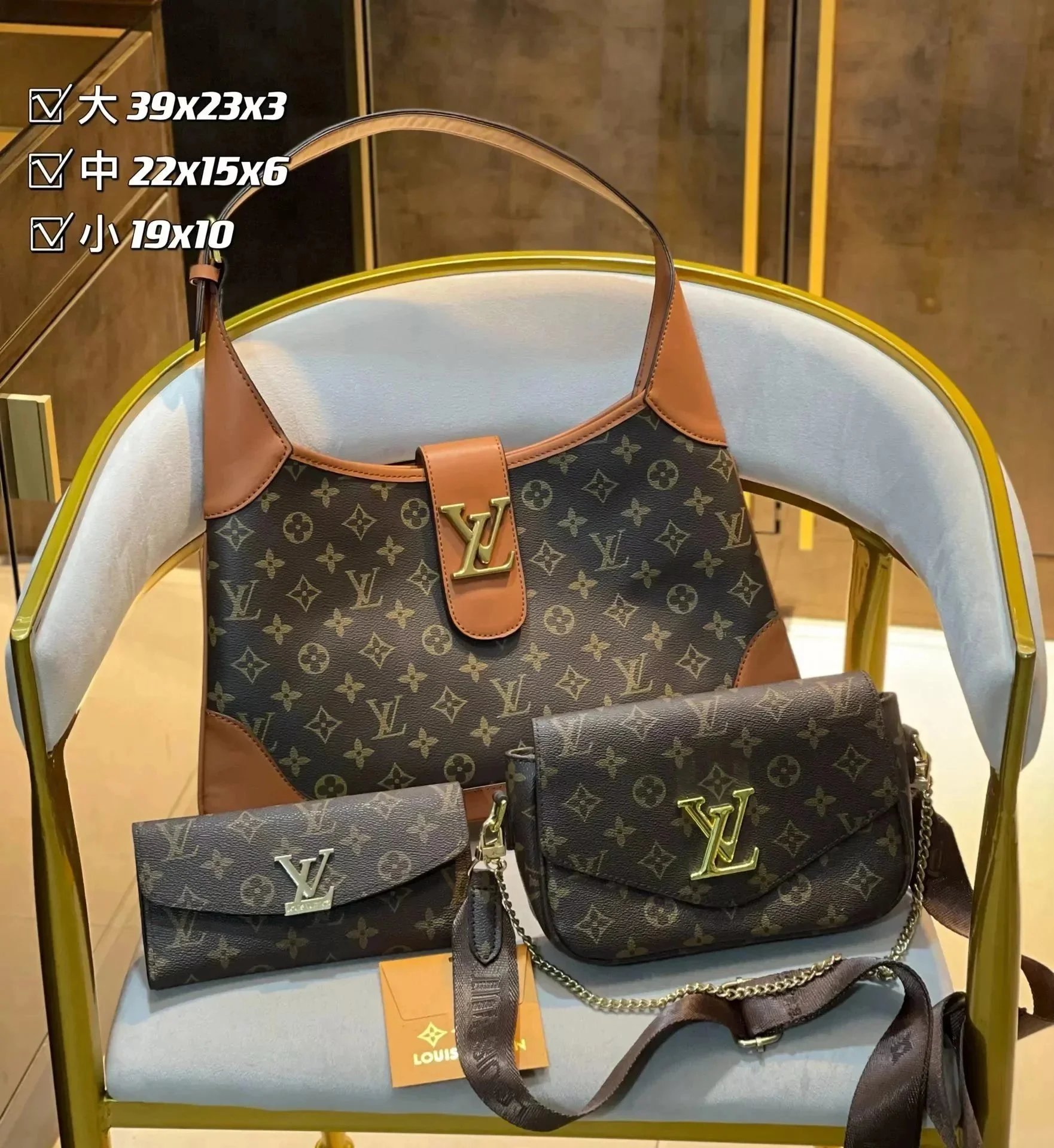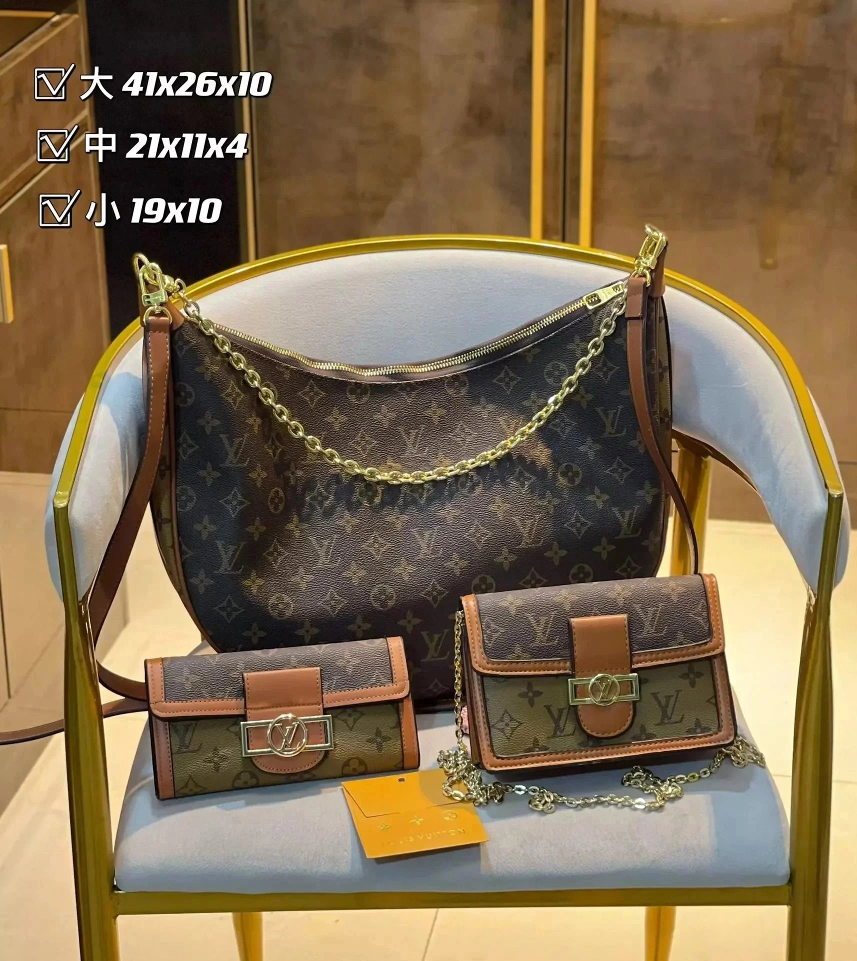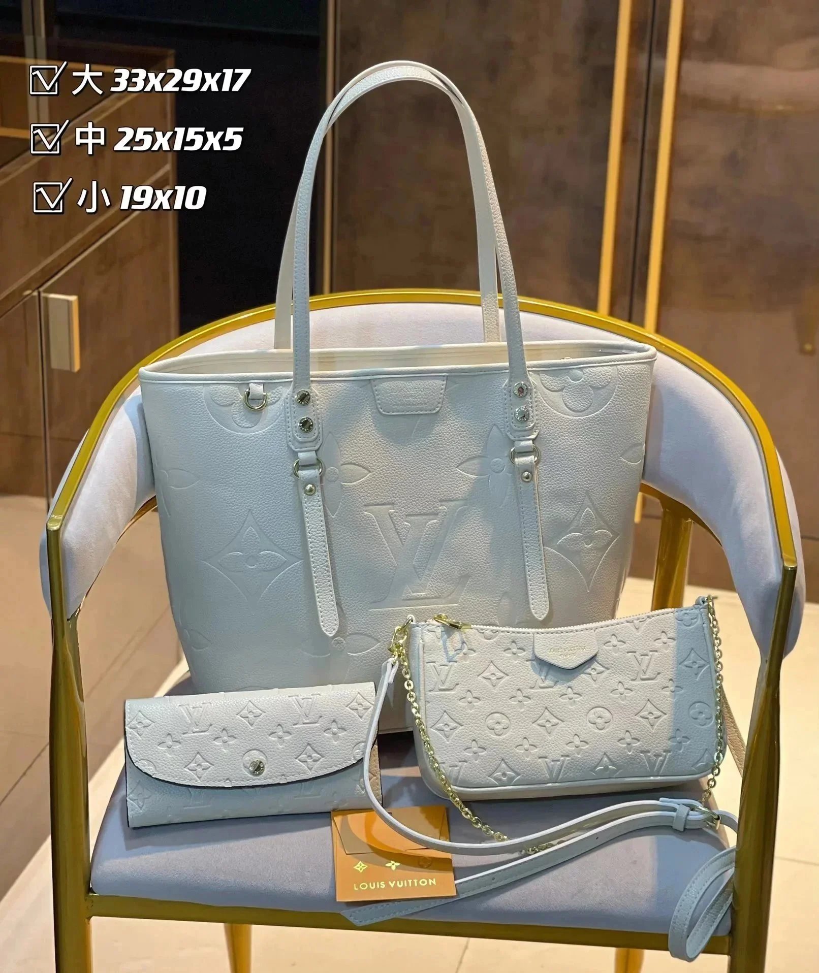 Elegant Christian Dior oblique print tote bag set featuring a large tote, crossbody bag, and coin purse in classic monogram patterns. Available in multiple colorways including pink, blue, gray, and black.