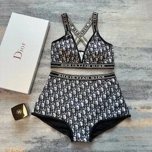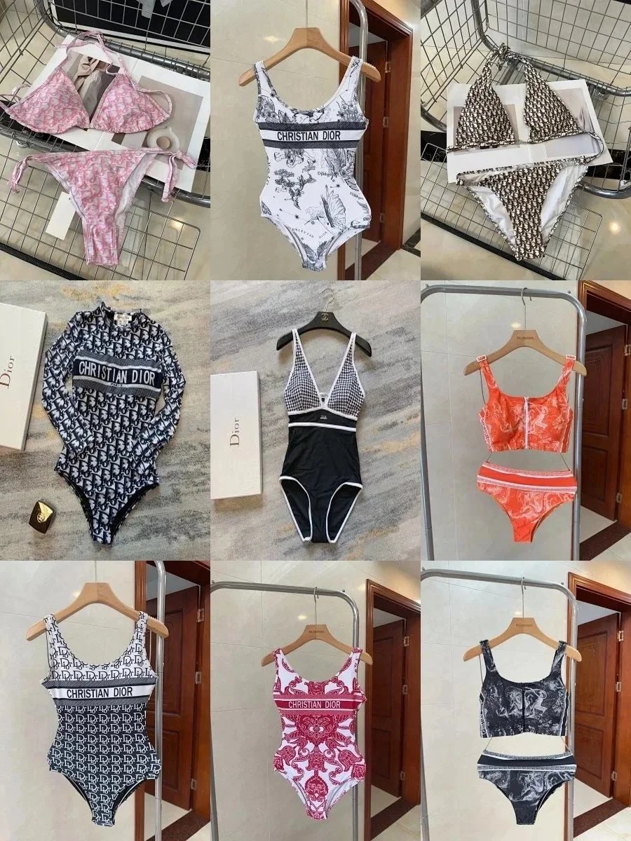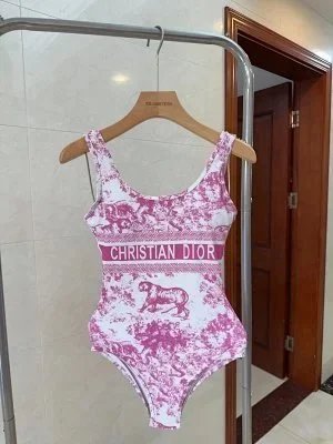 Elegant Christian Dior swimwear collection featuring signature monogram prints, bold colorways, and premium one-piece designs for luxury beachwear. Each piece combines iconic branding with modern silhouettes.