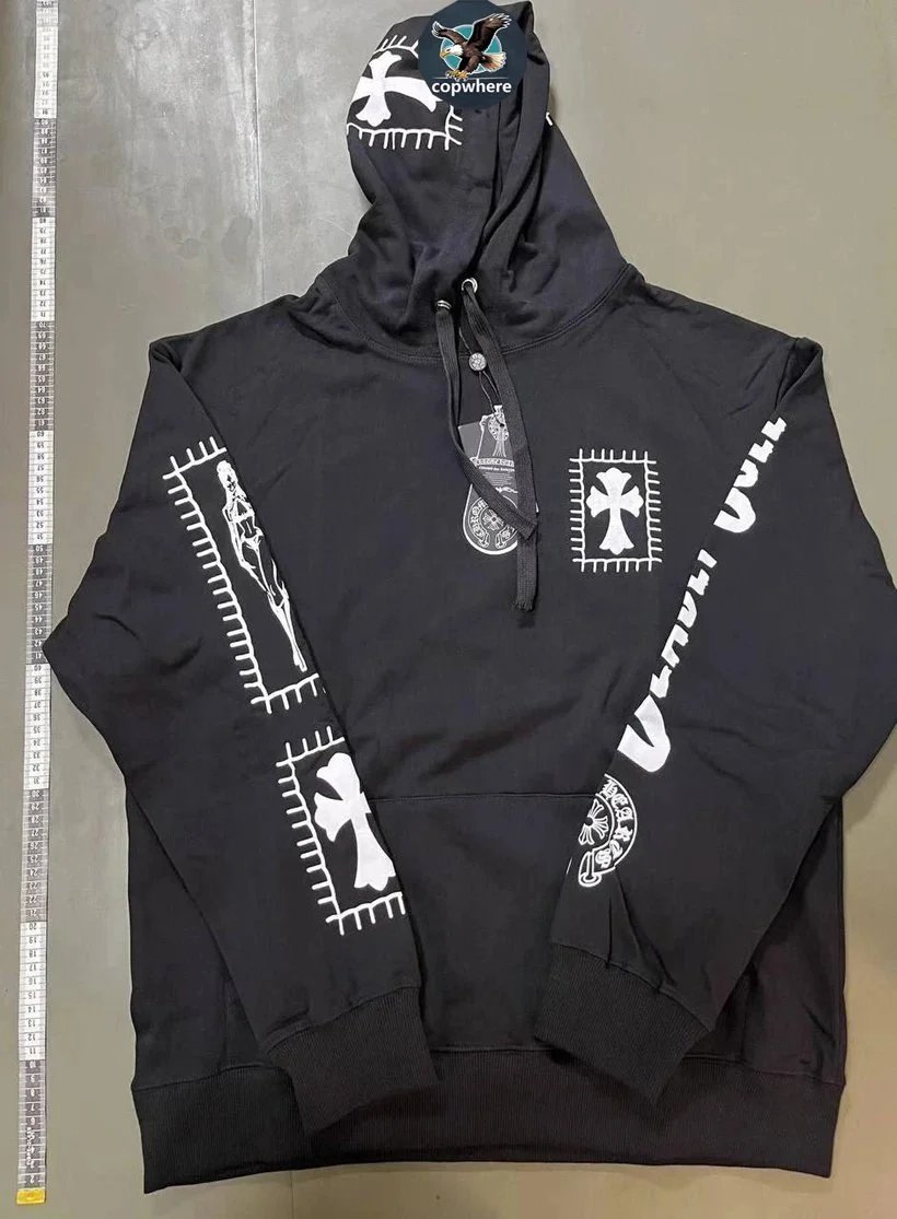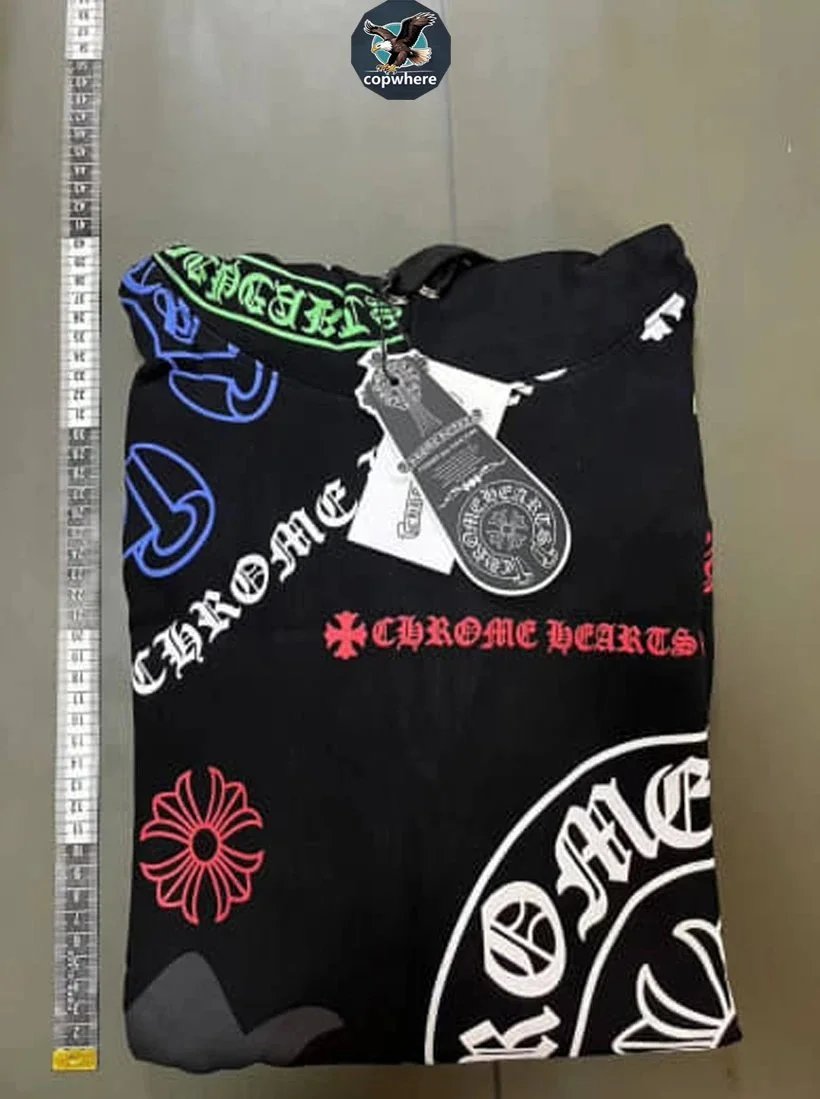 Luxury Chrome Hearts black hoodie featuring bold multi-color logos and iconic clover patterns. Perfect for high-end streetwear enthusiasts.