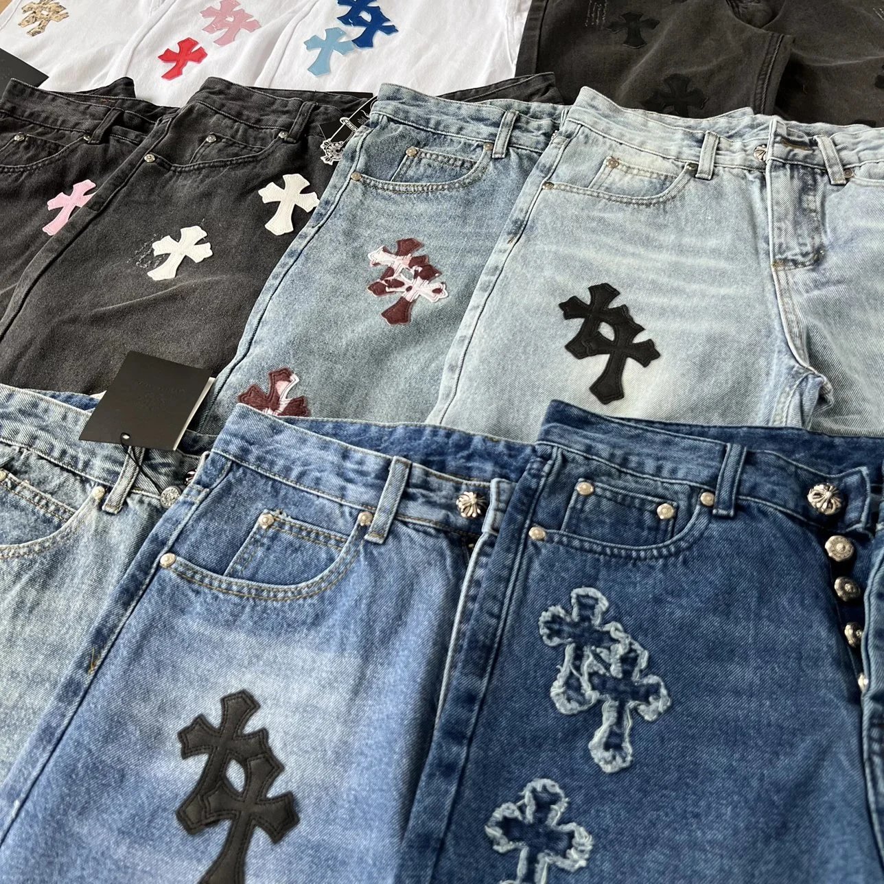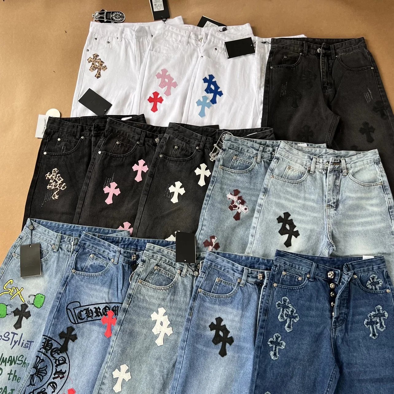 Explore the exclusive Chrome Hearts jeans collection featuring iconic cross embroidery in multiple colors and washes. Premium denim with distinctive branding for bold fashion statements.
