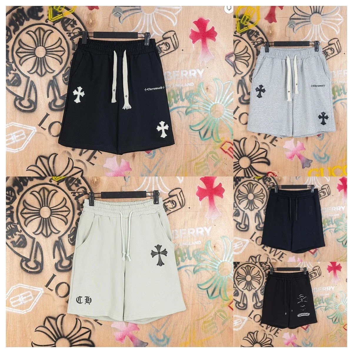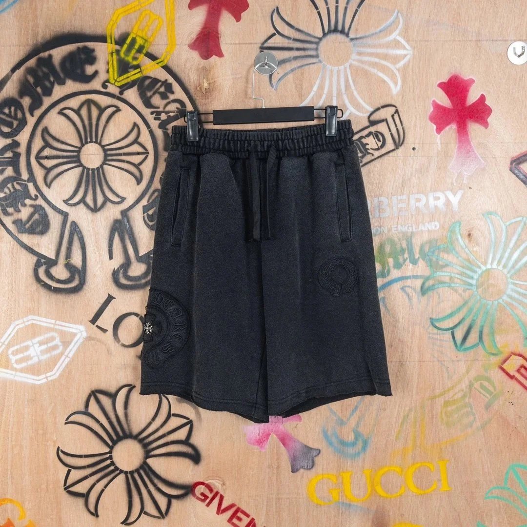 Premium Chrome Hearts sweat shorts featuring iconic cross embroidery and brand logo. Available in multiple colors for a bold streetwear look.