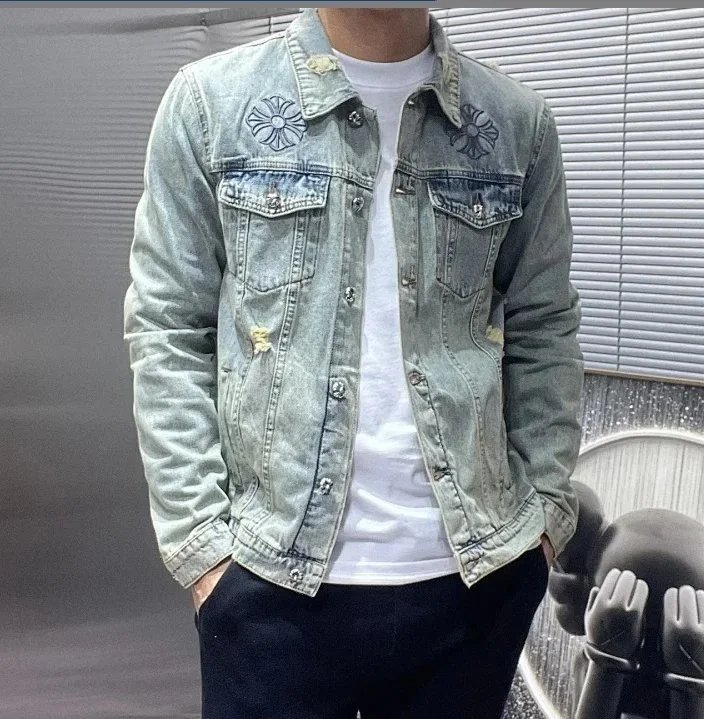 Premium Chrome Hearts denim jacket featuring intricate embroidery and distressed detailing. A bold statement piece for fans of high-end streetwear.