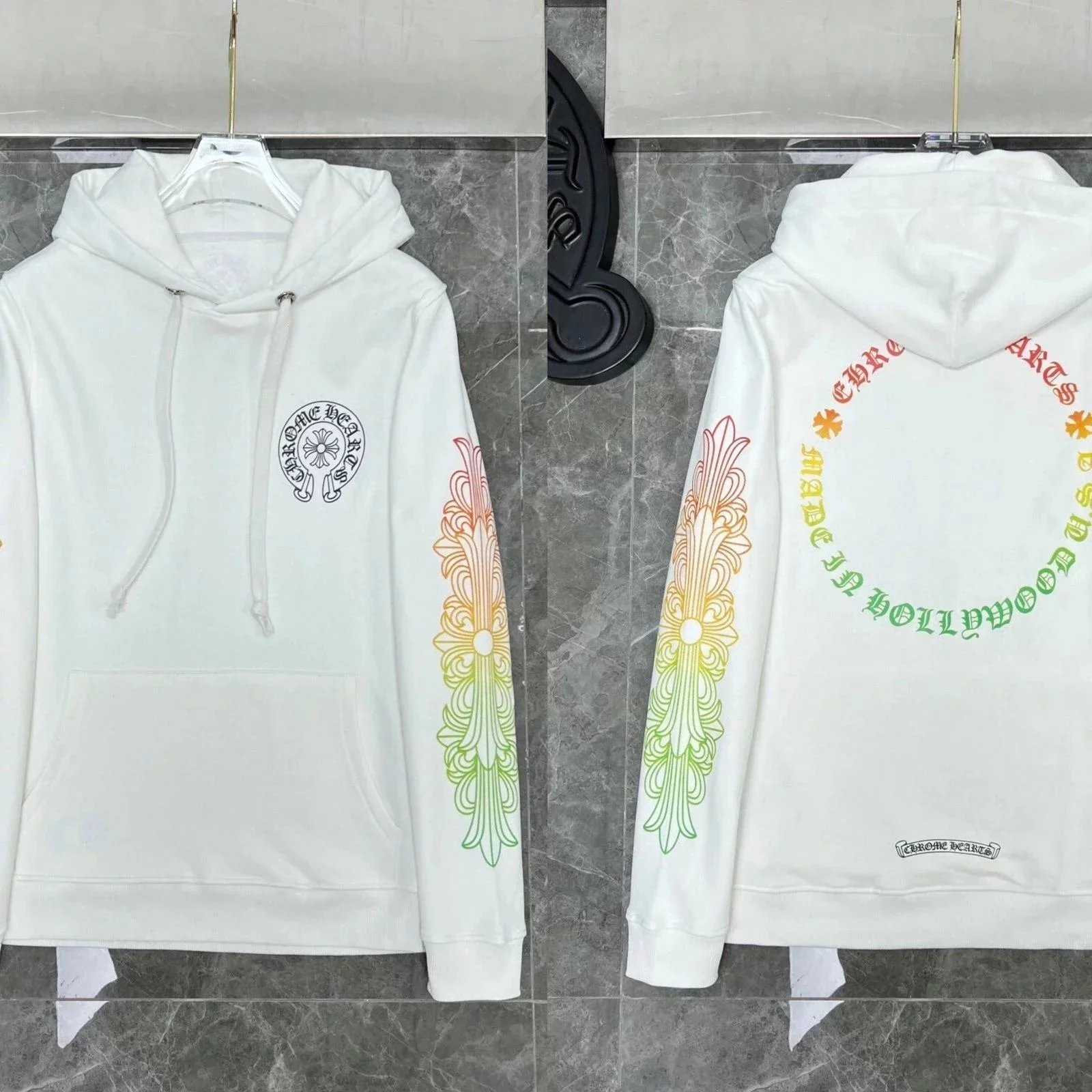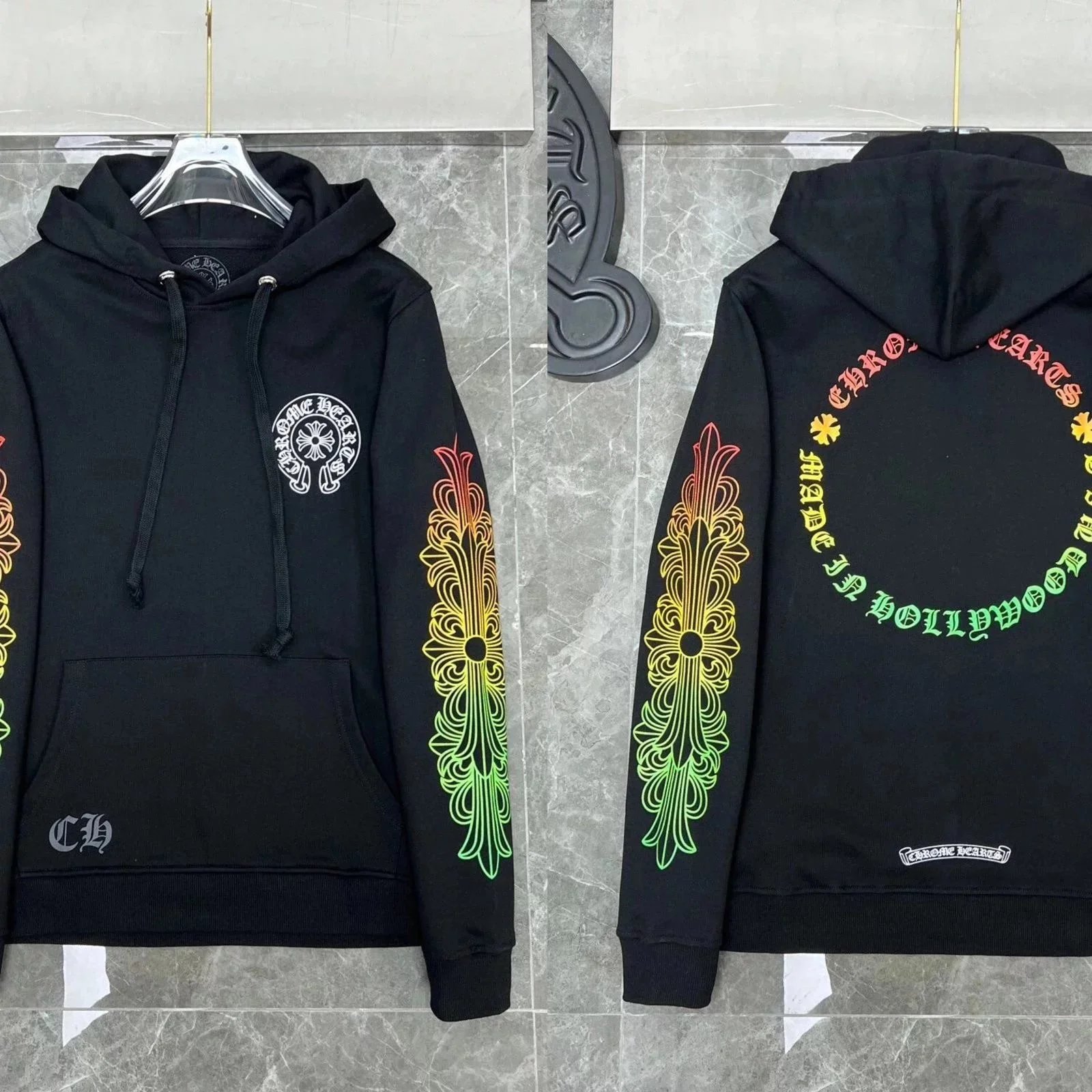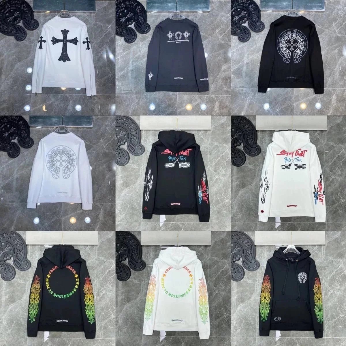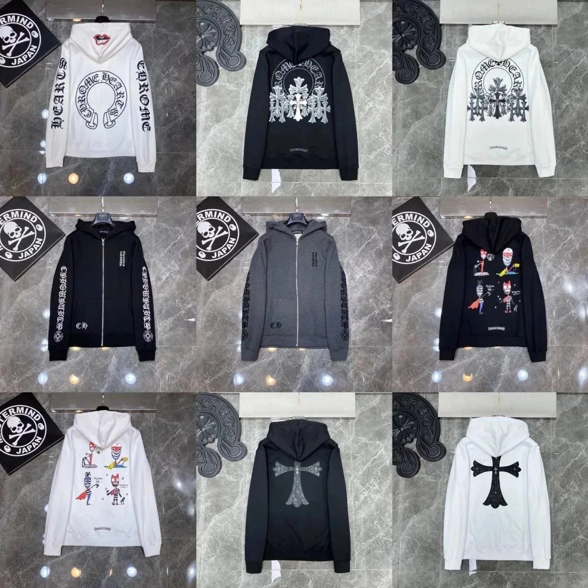 Premium Chrome Hearts hoodies featuring iconic skull, cross, and floral embroidery designs in black and white colorways. Perfect for streetwear enthusiasts.