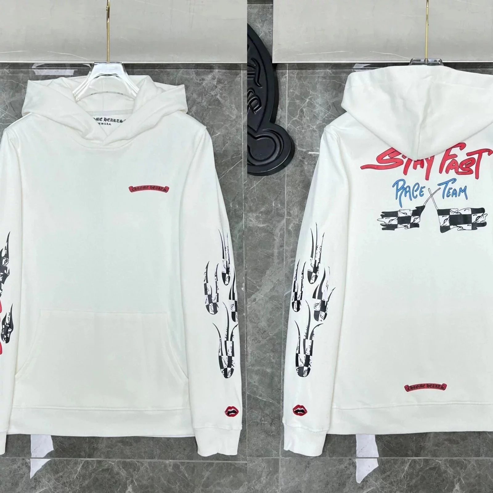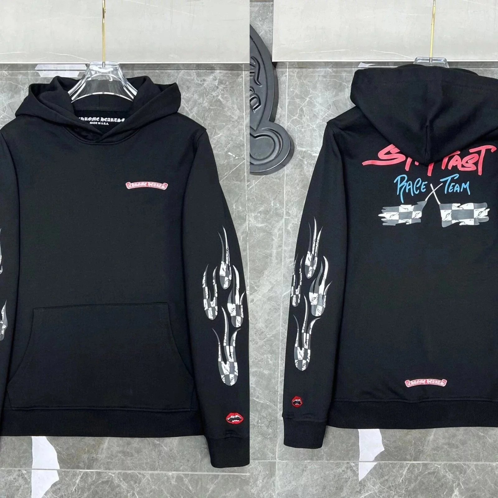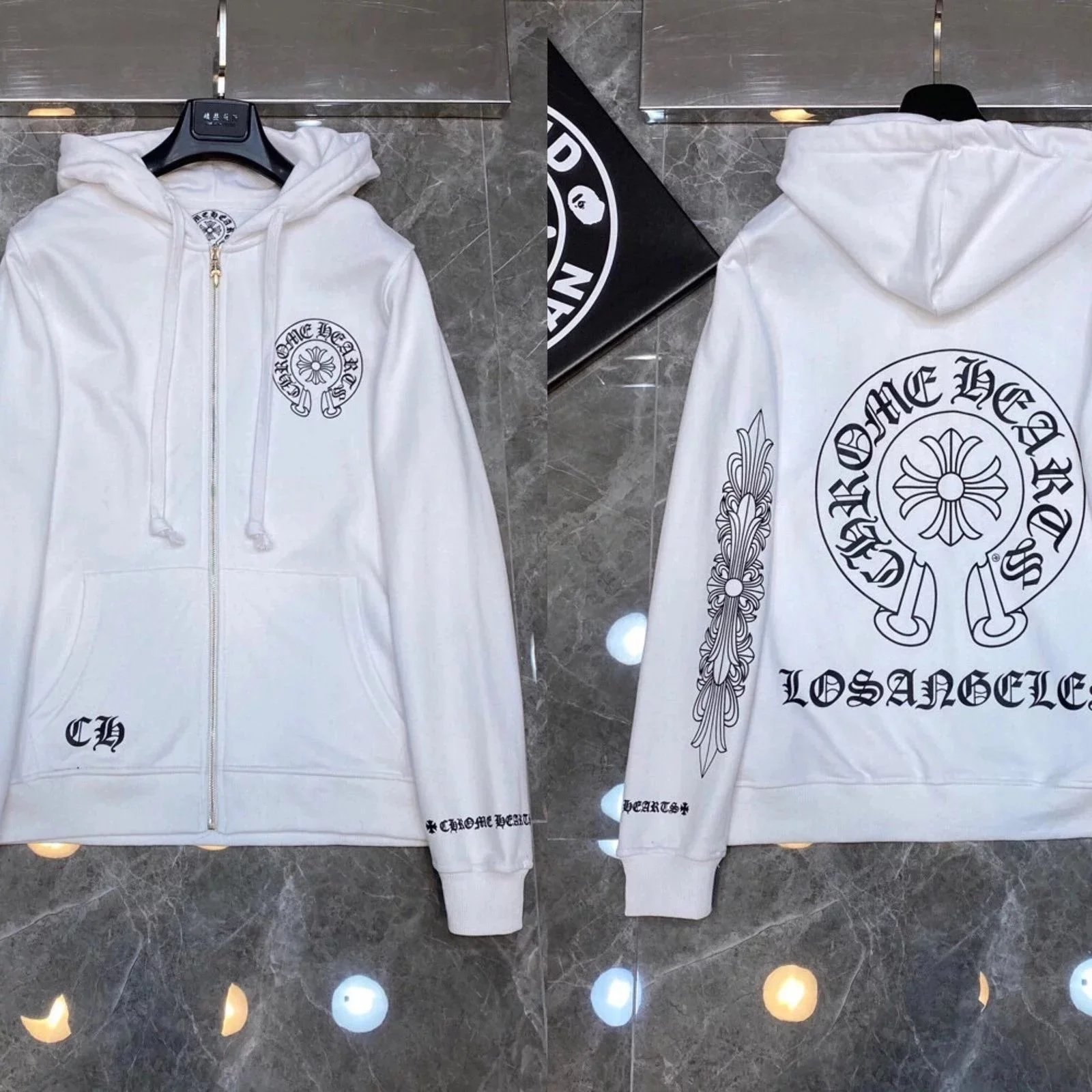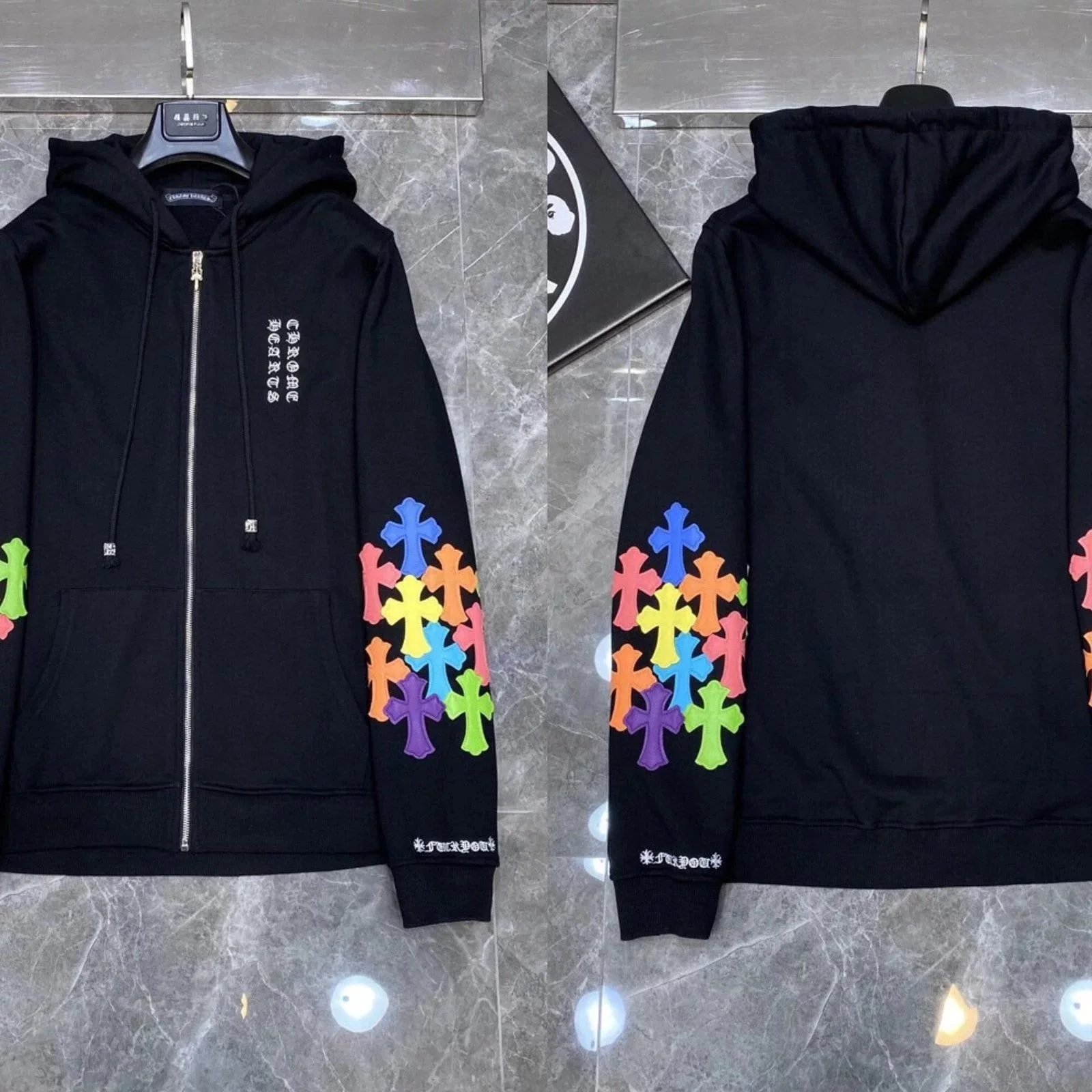 Premium Chrome Hearts hoodies featuring iconic skull, cross, and floral embroidery designs in black and white colorways. Perfect for streetwear enthusiasts.