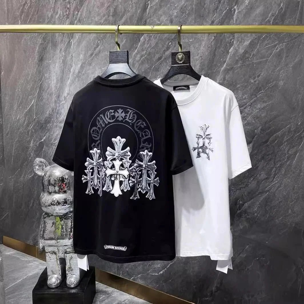 Chrome Hearts branded t-shirts featuring bold 'CAUTION' text and iconic cross logos in multiple colors. Designed for streetwear enthusiasts seeking high-end, statement pieces.