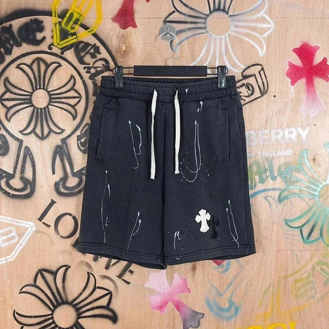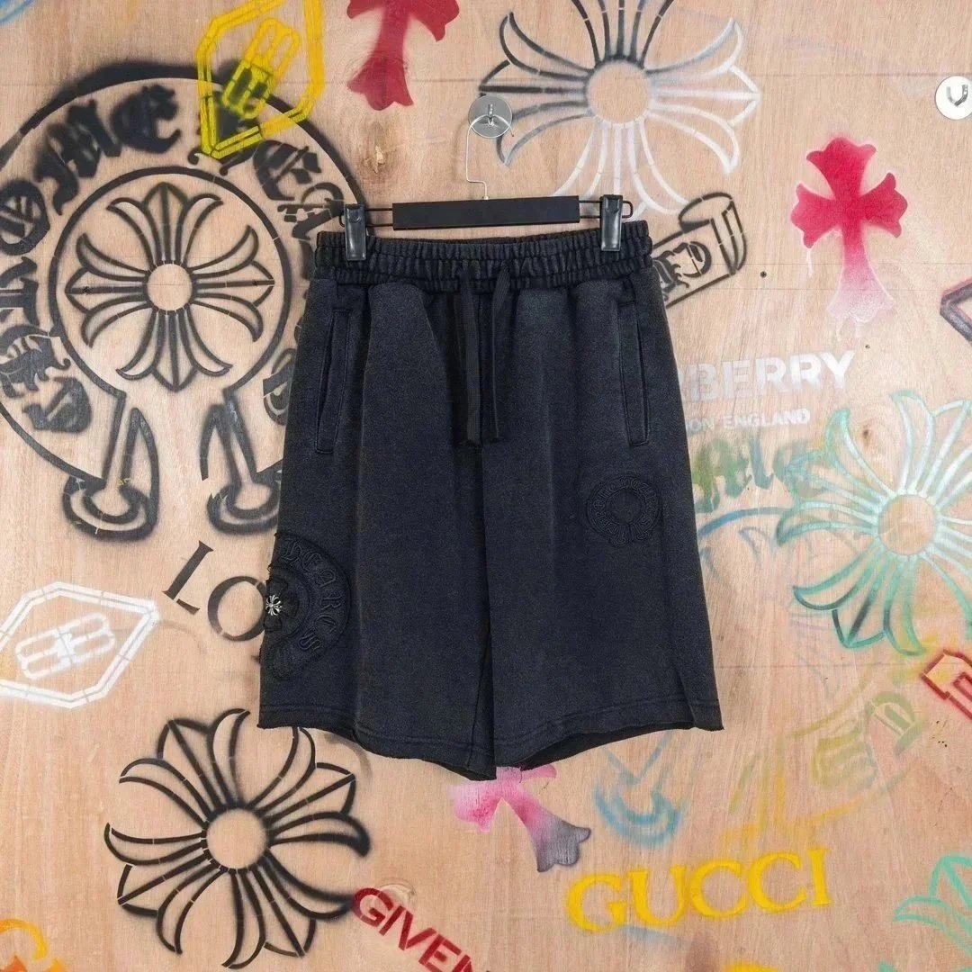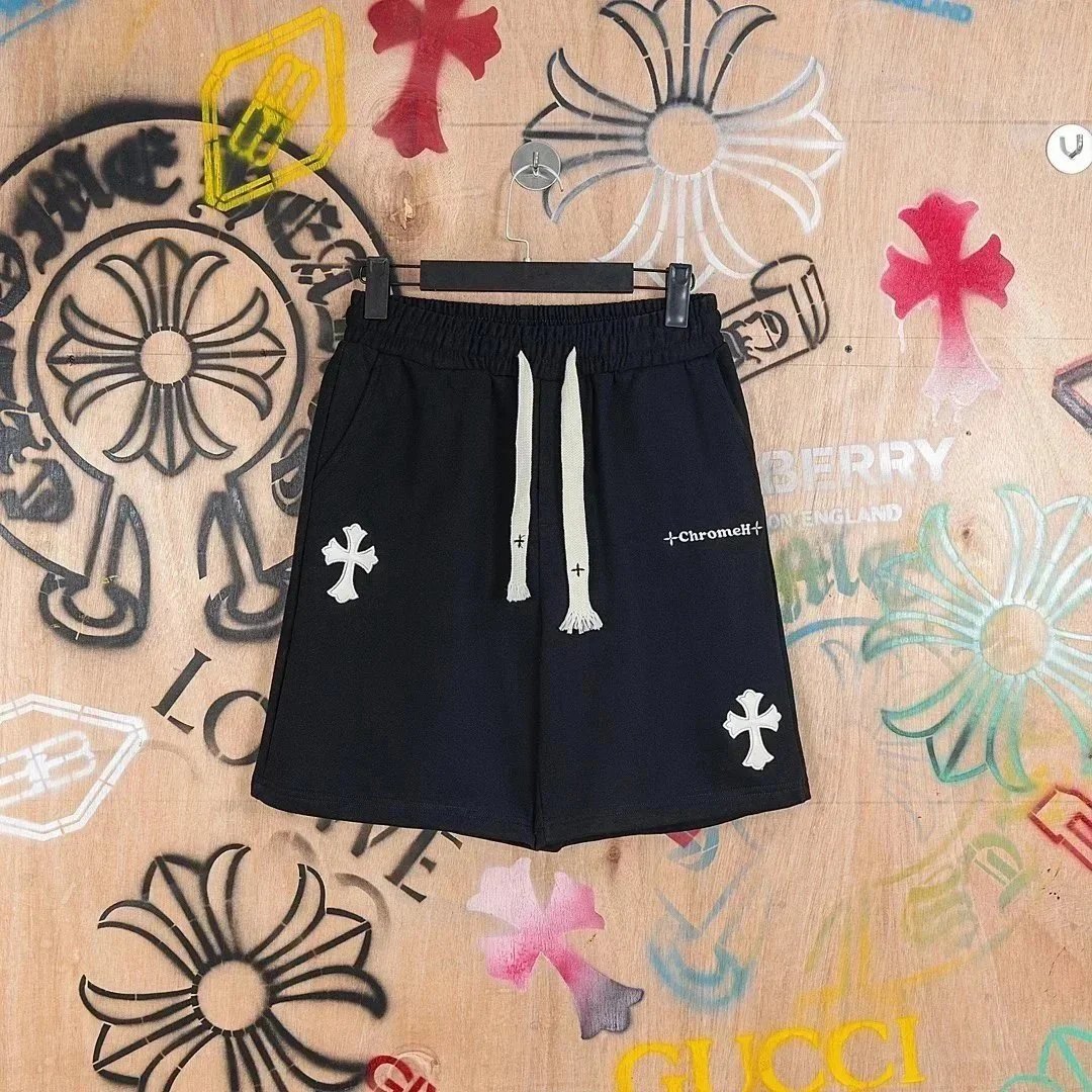 Stylish Chromef sweat shorts featuring a distinctive cross logo design. Available in black, grey, and mint colors with comfortable drawstring waistbands for everyday wear.