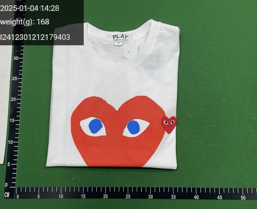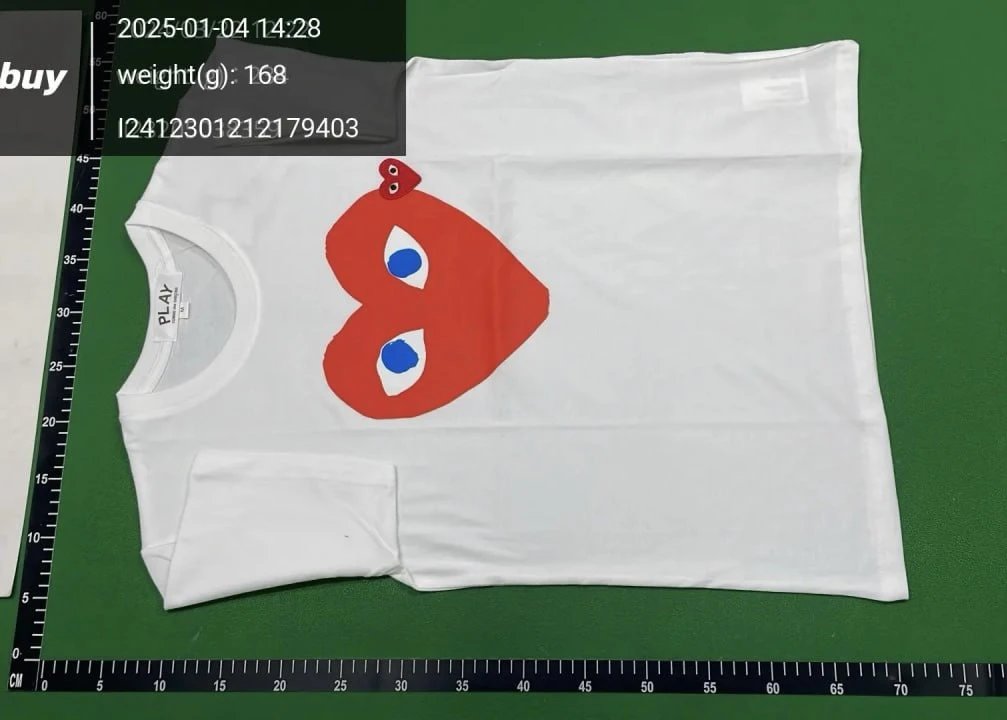 Discover the iconic Comme des Garçons PLAY collection featuring bold red heart logos on black and white t-shirts. Each design showcases unique patterns like camouflage, splatter, and stacked hearts for a statement look.