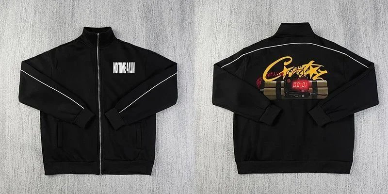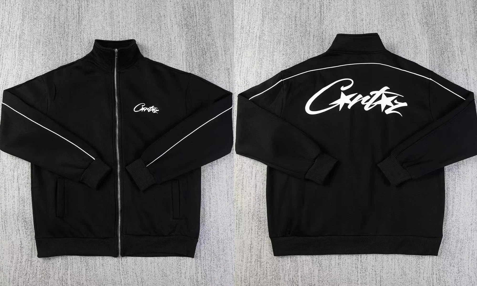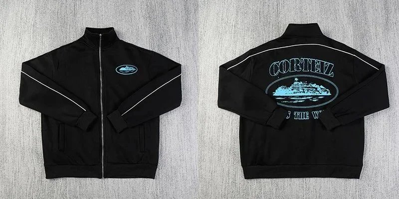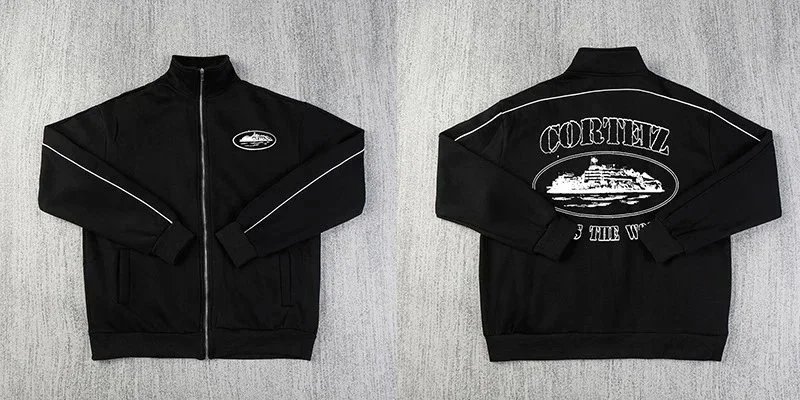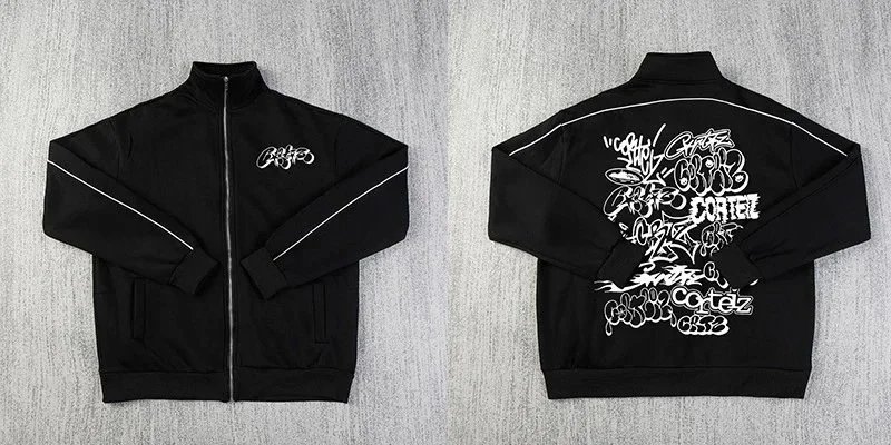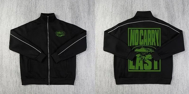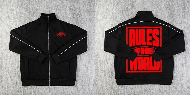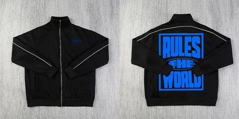 Explore the exclusive collection of Corte black zip-up jackets featuring bold designs like 'Rules the World' and 'No Carry Last'. Each jacket showcases unique graphics and vibrant colors for a standout streetwear look.