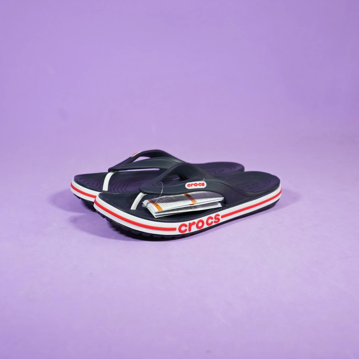 Comfortable Crocs Classic Flip Flops in navy blue with bold red and white stripe detailing. Perfect for casual wear and beach days.