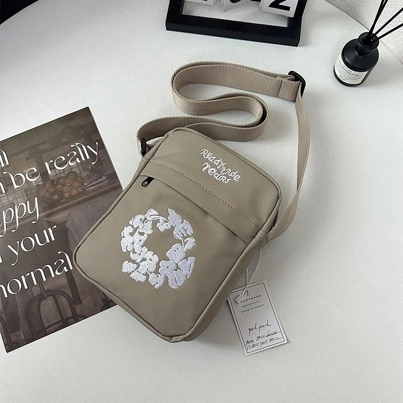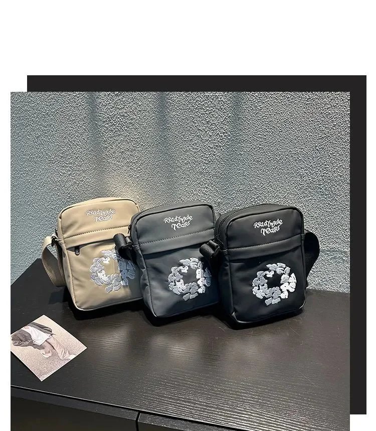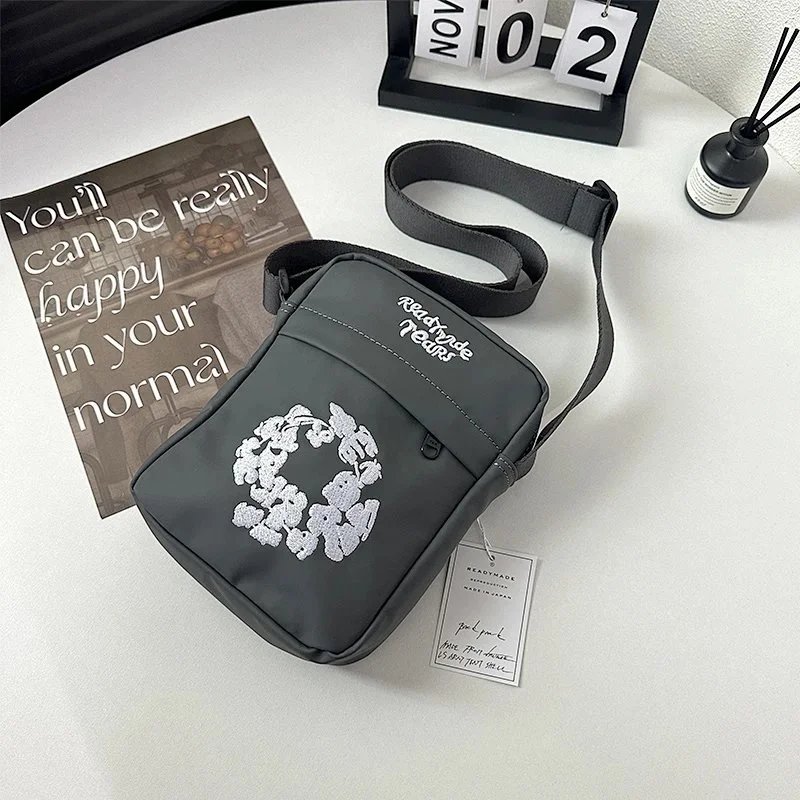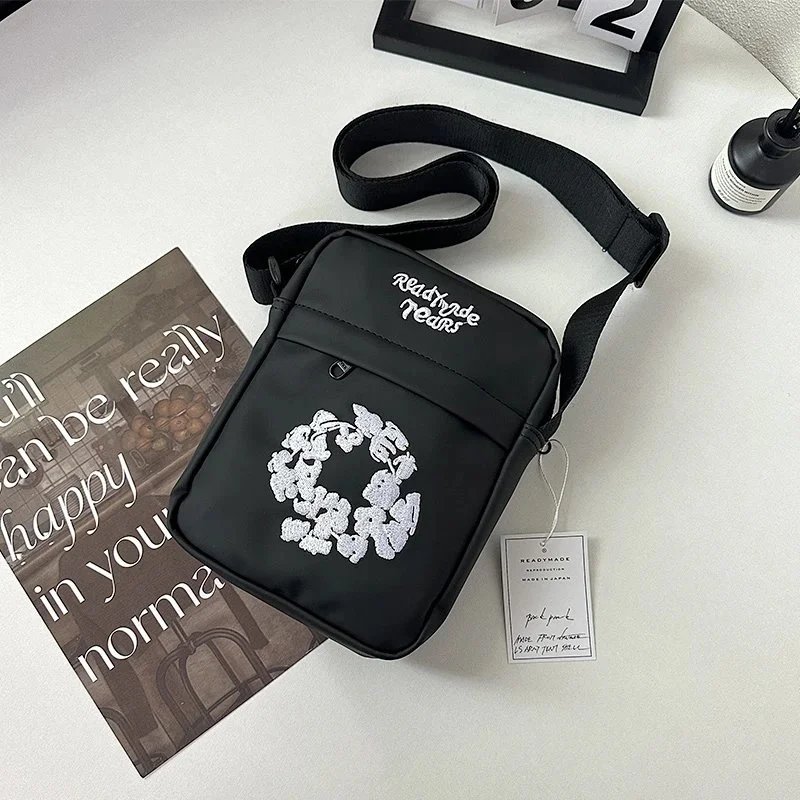 Compact crossbody bags featuring a unique bunny wreath embroidery and 'Ready to Ride Tears' text. Available in black, beige, and dark gray with adjustable straps for versatile daily use.