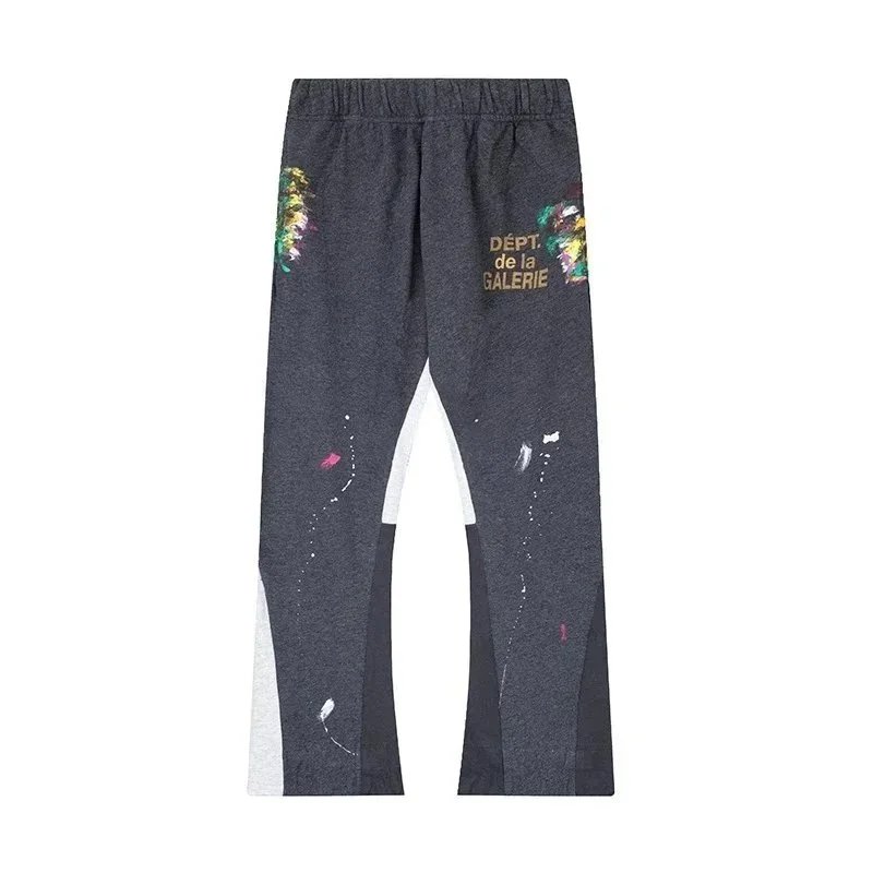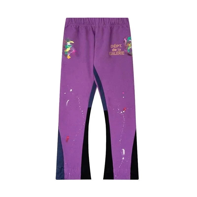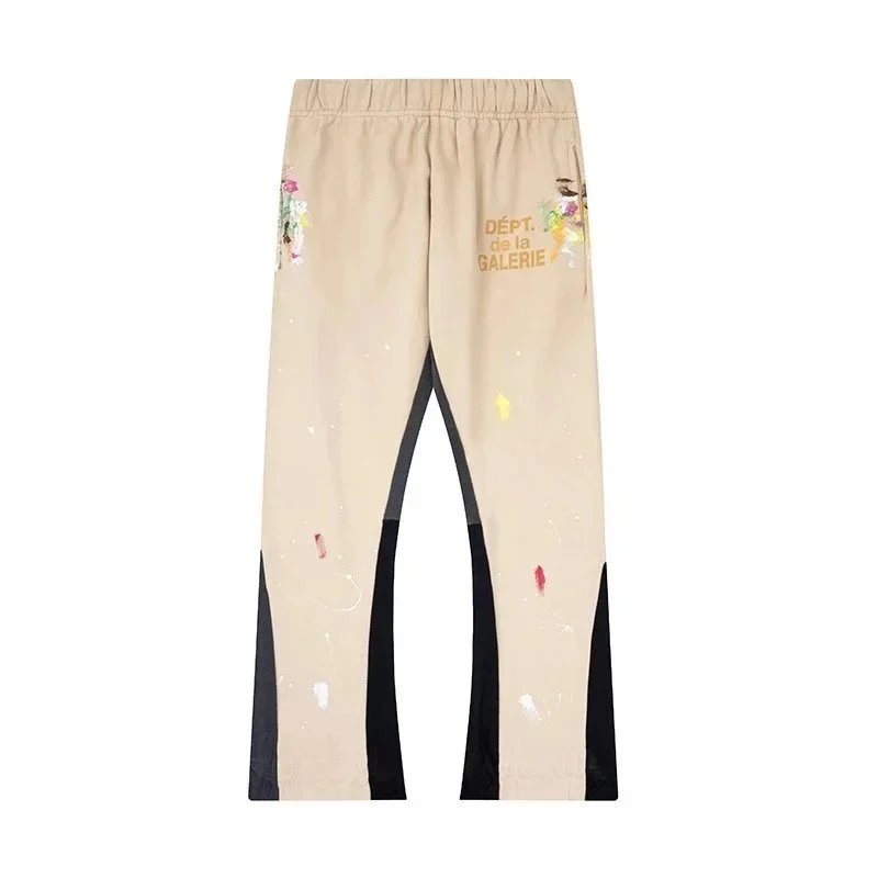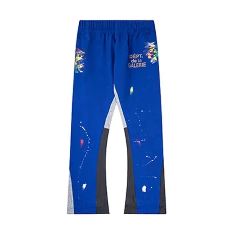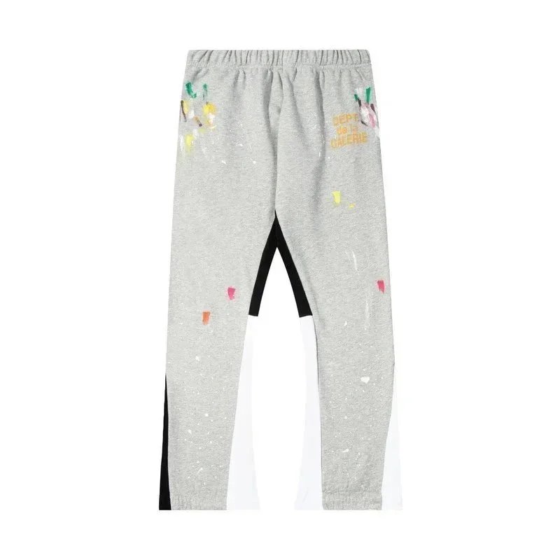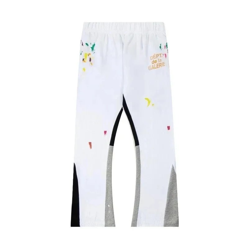 Stylish white track pants featuring vibrant paint splatter details and bold color-blocked panels. Designed by DEPT de la GALERIE for a modern, artistic look.