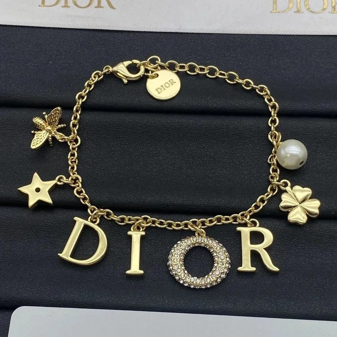Elegant Dior gold charm bracelet featuring a pearl, star, bee, clover, and letter charms spelling 'DIOR'. A luxurious statement piece for fashion enthusiasts.